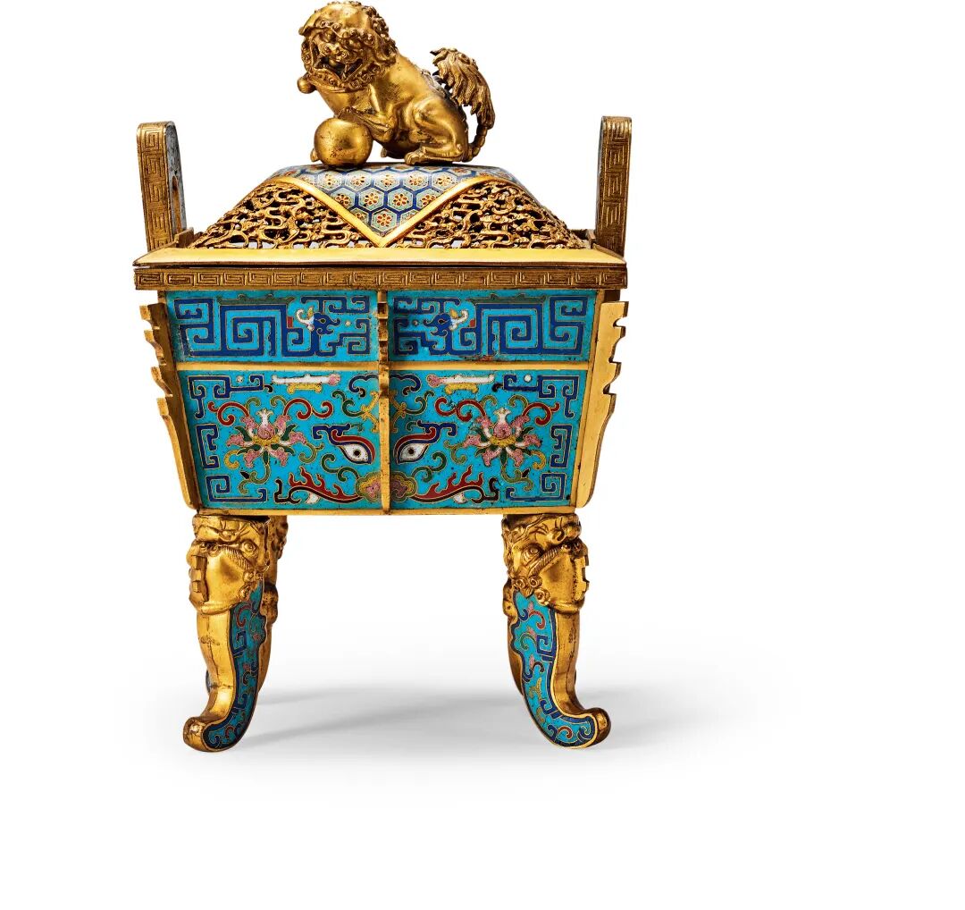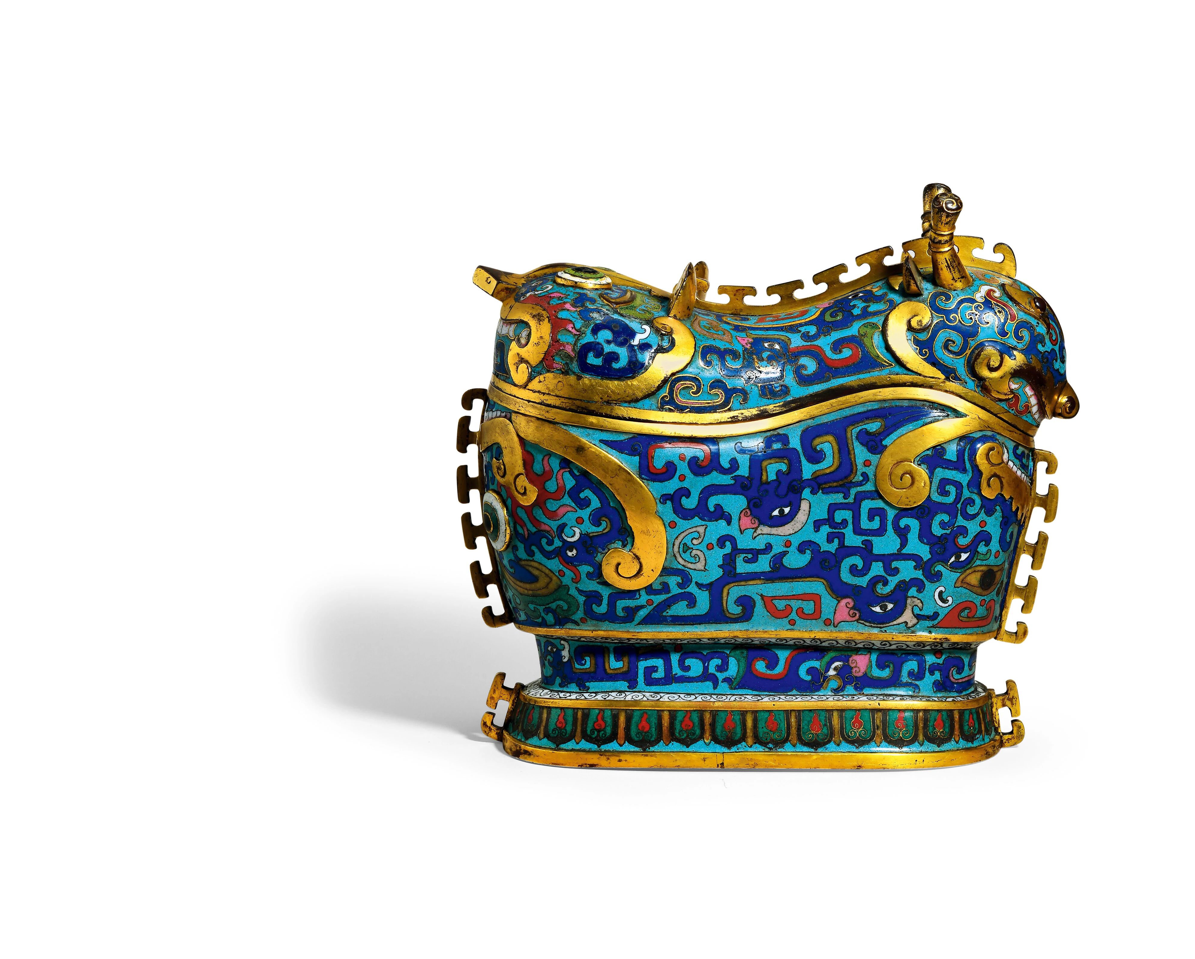 觥是中国古代盛酒器。流行于商晚期至西周早期。椭圆形或方形器身,圈足或四足。带盖,盖做成有角的兽头或长鼻上卷的象头状。有的觥全器做成动物状,头、背为盖,身为腹,四腿做足。且觥的装饰纹样同牺尊、鸟兽形卣相似,因此有人将其误以为兽形尊。然觥与兽形尊不同,觥盖做成兽首连接兽背脊的形状,觥的流部为兽形的颈部,可用作倾酒。此件掐丝珐琅仿古青铜觥,器分盖、底两部分。盖作饕餮。背部作镀金出脊,短双翅。通体施蓝色珐琅地,掐丝云雷纹并饰红色、宝蓝色鸾凤纹。觥头为彩色饕餮,尾及足缘饰花卉纹。此器物造型壮重古朴,色彩纯正典雅。此器为清乾隆年间仿照商代青铜盛酒器兕觥而作,造型古朴,釉色纯正,典雅风格,为乾隆朝标准器。