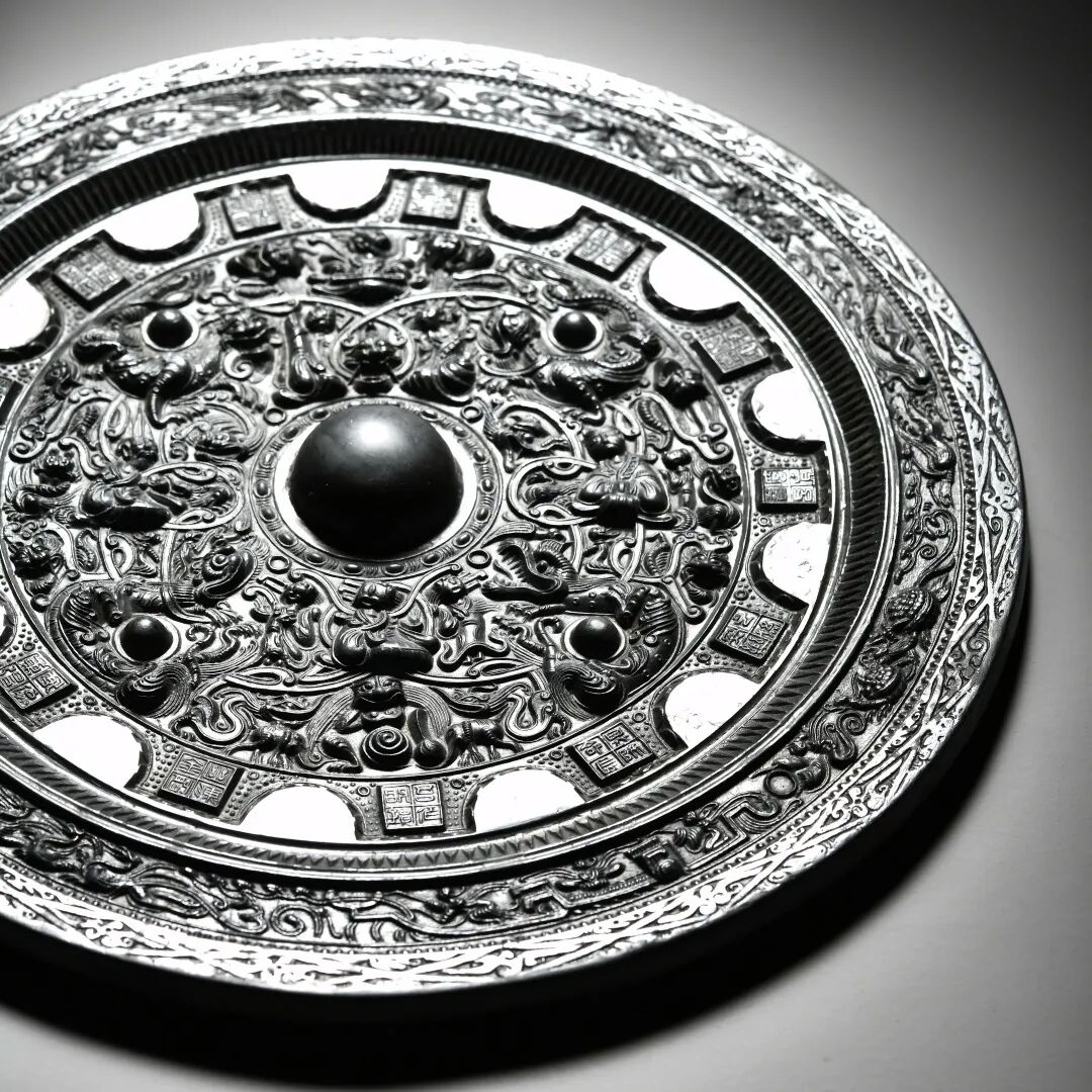 铭文:吾作明鏡,幽湅金剛,配像萬疆,統德序道,敬奉賢良,雕刻無極,伯牙作樂,天禽並存,嗻業主陽,學者當湅,富貴番昌,子孫安樂,其師命長。