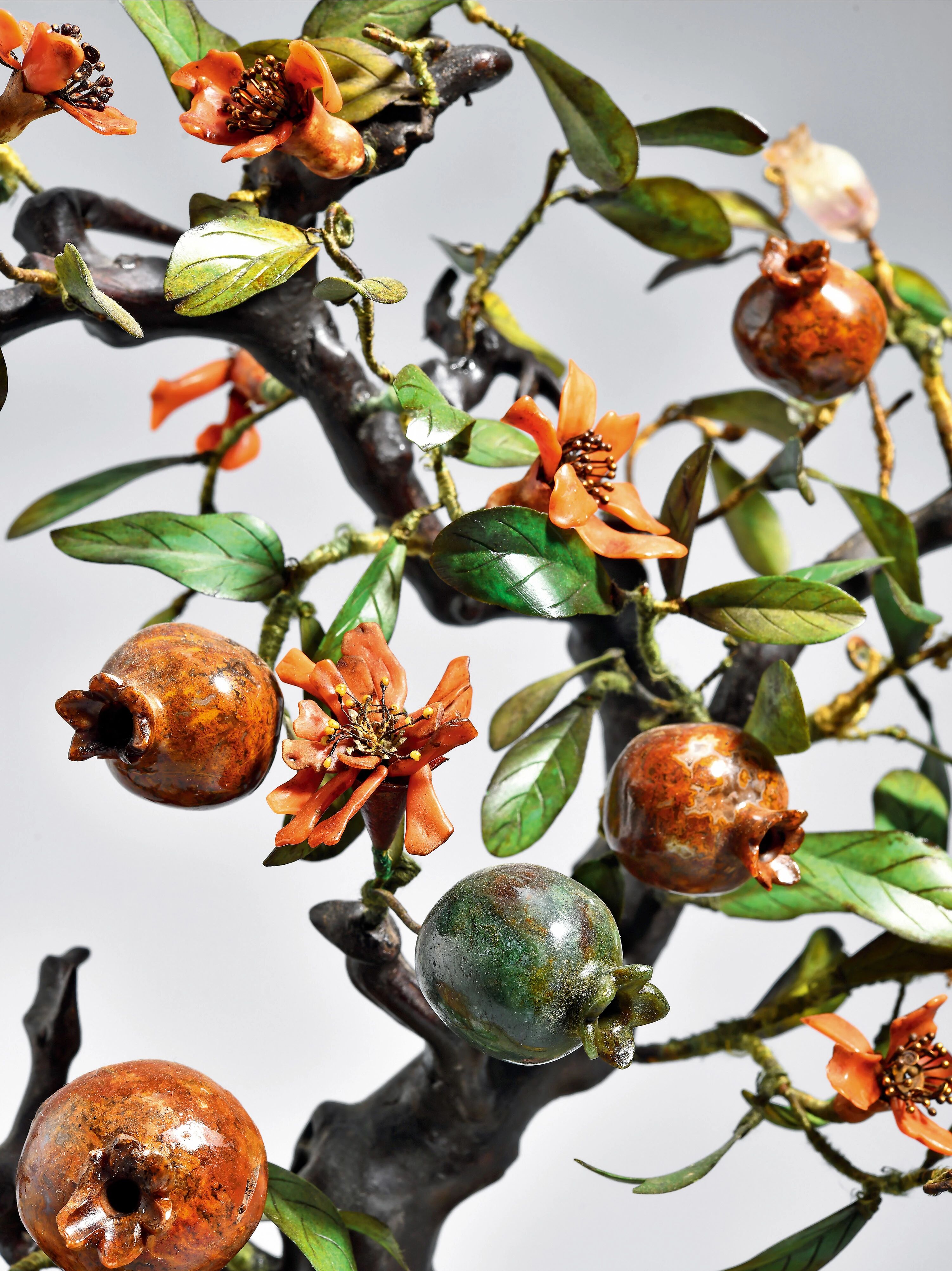此件像生石榴摆件,下设铜盆,作倭角四方状,深腹下承四枚云足。外壁鎏金,施浮雕、錾刻工艺,口沿刻回纹并嵌一周红宝石,四壁以浮雕夔龙纹为饰,两面正中开光嵌镂雕莲鹤白玉佩,兼具仿古与繁复富丽之风格。盆中以百宝设奇石灵芝,其间生一石榴树。满树生翠叶红花,兼白玉、玛瑙等玉石巧雕的各色宝果,栩栩如生间又有晶莹璀璨之气质。