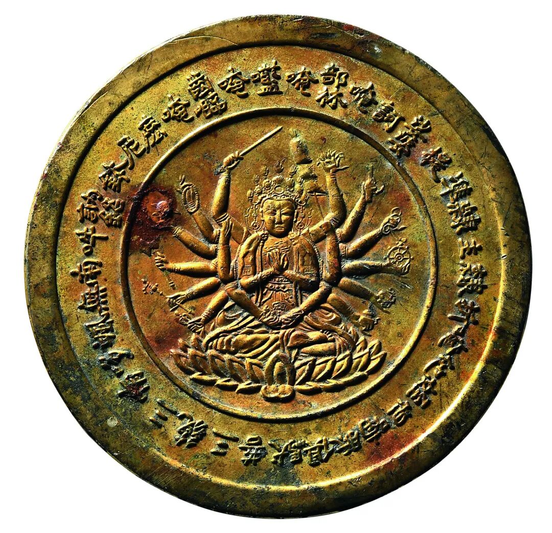 佛教题材铜镜,采用高浮雕的表现技法,镜体全鎏金,工艺精湛,版工刻画细致,头版头模,两面均有纹饰,配置少见,镜背中央饰以一尊十八臂准提佛母正面坐像,其中十六臂外伸,均手持法器,外饰一周梵文准提咒。镜面中央素面平滑光亮,外圈也饰有一周梵文准提咒,整体布局合理舒朗,设计思想独特,构图新颖。梵文镜搭配准提佛母极为少见,再配以梵文准提咒,有着极强的消灾祈福的寓意。准提,是护持佛法,为众生延寿护命的菩萨,意译作清净。佛经记载,常持诵准提咒,能够灭除十恶、五逆一切罪障,成就一切殊胜的功德。修习准提法需修持准提镜,准提镜即代表准提佛母,修习者通过镜面观像了解自身修为。修持准提镜还需镜坛,此镜中已饰有浮雕准提佛母纹饰,自然不需要以准提镜替代,故此镜即为镜坛,既可佩戴亦可供于佛坛,为功用融合,艺术创新的产物。此镜状态极佳,铸工精细,品相完美,遗存甚少,目前仅见《故宫藏镜》著录一面,且没此面精美,从纹饰布局及功用意义上可知此镜并非日常用具,应为佛教徒修持准提法的法器,从镜体全鎏金可见其等级之高,极为难得,精美品。