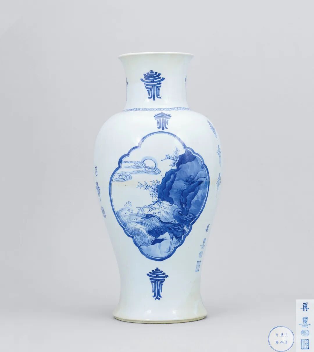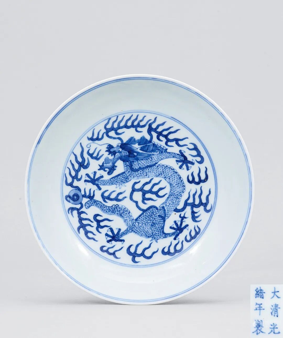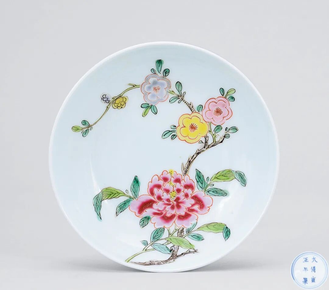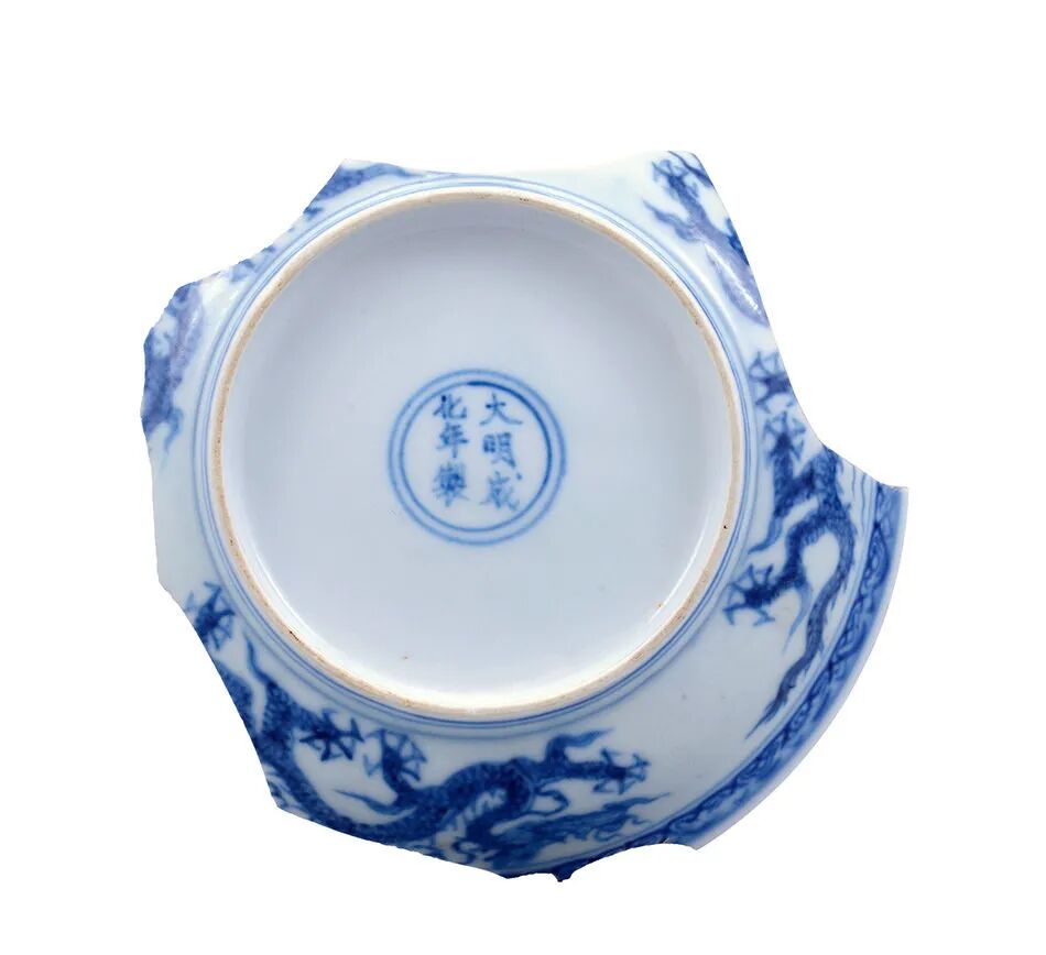 此盘原藏家为上世纪九年代于日本通过著名古董商平野先生(Hirano)介绍购入,带回香港后便送到香港苏富比,予当时亚洲区主席朱汤生先生鉴定并给予正面评价。此盘虽缺约六处,但其主体却极为完整(没有冲线小崩),完全没有窑址出土的痕迹,为存世之物机会极高。因为一般窑址出土的成窑遗物都支离破碎,不可能出现如此完整的主体,更显珍贵。此盘乃使用波斯进口的苏麻离青作青花钴料,而成化晚期使用平等青的宫碗等明显不同,可见为成化早期的官窑产品。成化早年官窑生产并不多,存世品极少,以及此盘青花有宣德青花的特征。苏麻离青名字是来自伊拉克,萨马拉(Samarra)的钴蓝料,故中国进口时便发音为‘’苏麻离”青。从元代开始,中国大量青花瓷器从丝绸之路到达伊拉克的首都巴格达,当时巴格达为中东最大物产集散地,而中国瓷器及丝绸便是最受欢迎的产品。(何明德)
