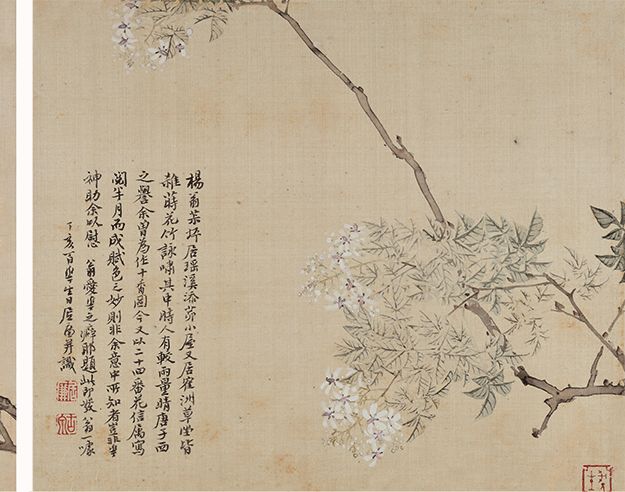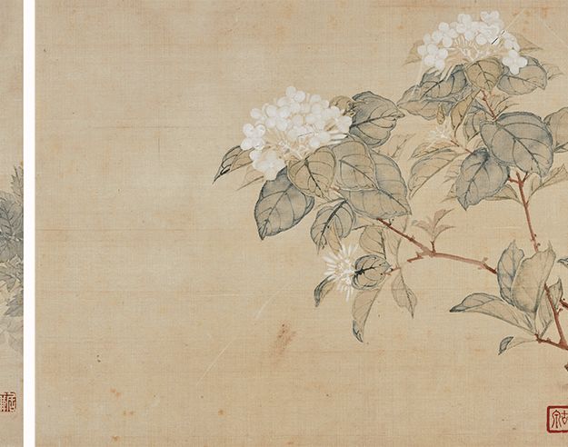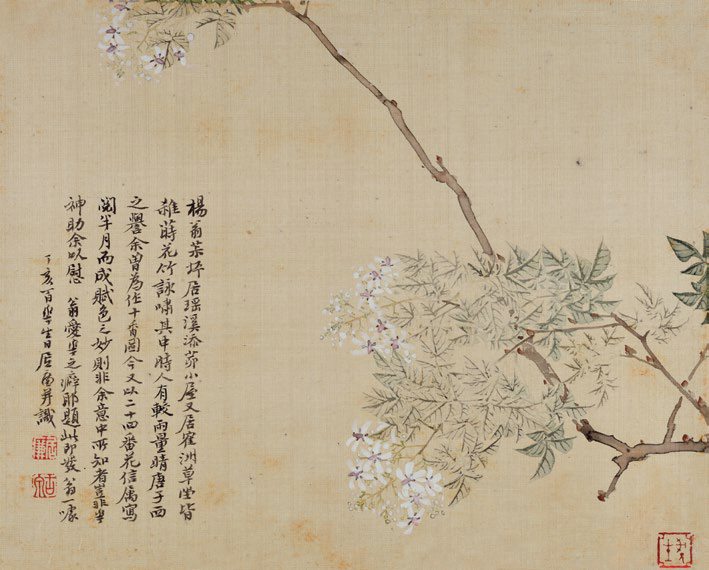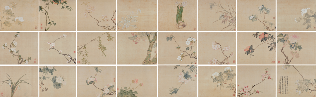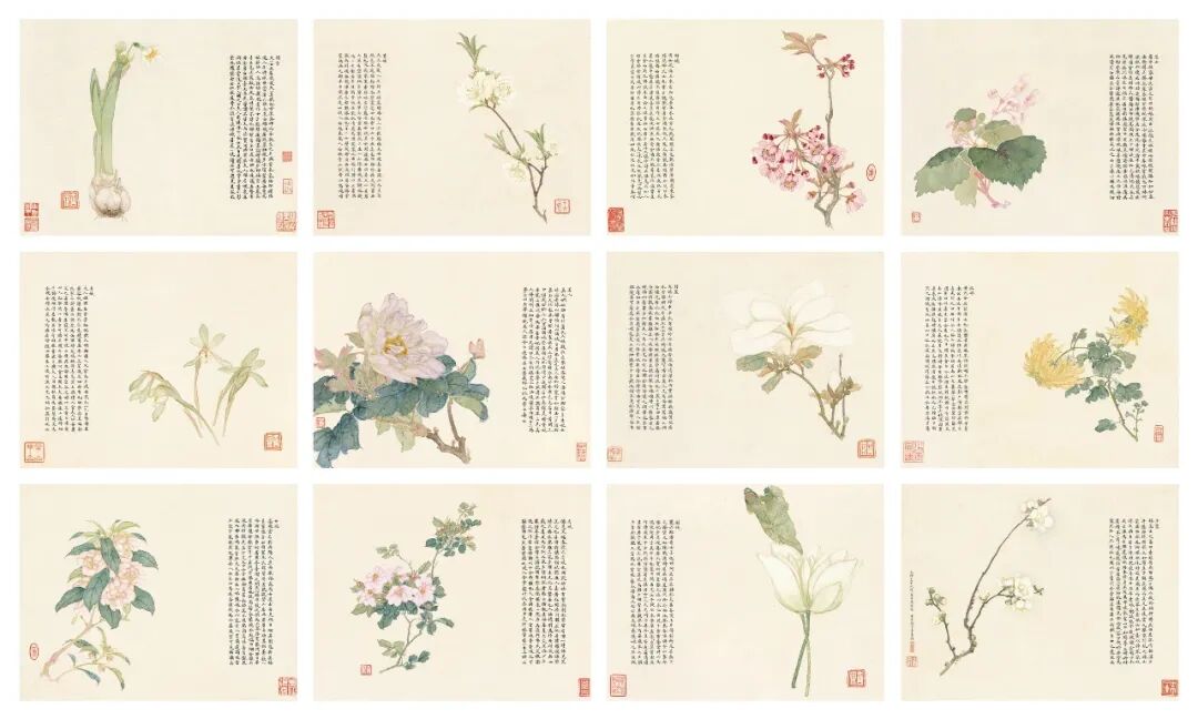 此册《二十四番花信》共计二十四开,明丽研秀,为撞水撞粉法写花卉的典范之作。杨永衍,为是时广州文坛耆宿大贤,诗书画俱精,于是时书画、文学及政商界声誉颇重,又富收藏,与两粤名人过从不辍。