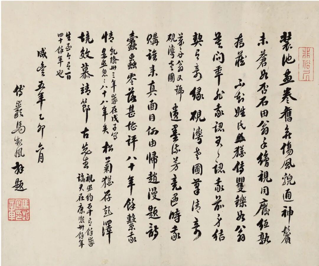 识文:装池画卷旧无伤,风貌通神鬓未苍。如否石田翁手绘,视同废纸孰为藏。不知姓氏照犹传,矍铄如翁莫问年。非我认君君认我,前身结契有奇缘。砚湾老圃摹清奇(芥舟翁又号砚湾老圃),遗墨流芳竞遇时。我购谁来真面目,何由归赵漫题诗。蠹虫零落甚堪评,八十年余系我情(乾隆卅三年岁在戊子写是照忽忽八十八年矣)。松菊犹存彭泽境,效慕靖节古先生(视照约五十有余岁论,君在康熙卅余年生至今有百四十余年也)。咸丰五年乙卯六月傅巖马起凤拜题。