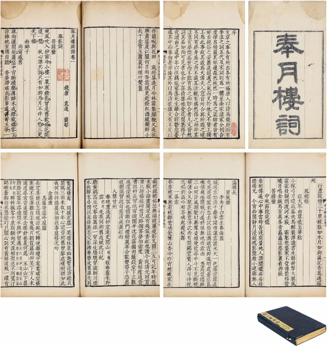 此本函套日本古董商细野申三墨笔题名。前刊吴江郭麐、仁和钱枚、金匮杨芳灿三家序言及题词,内收《春影词》一卷、《柳雪词》二卷、《伴云词》二卷、《泥忆云室词》一卷、《通潞泛舟词》一卷、《无定庵词》一卷,末收昭文邵广铨跋尾。旧装保存,纸墨俱佳。