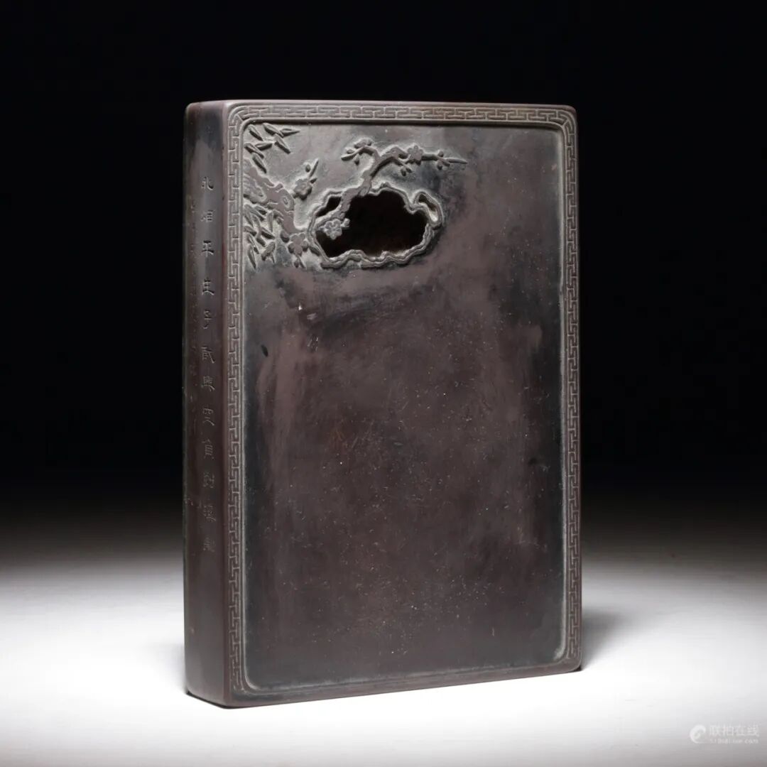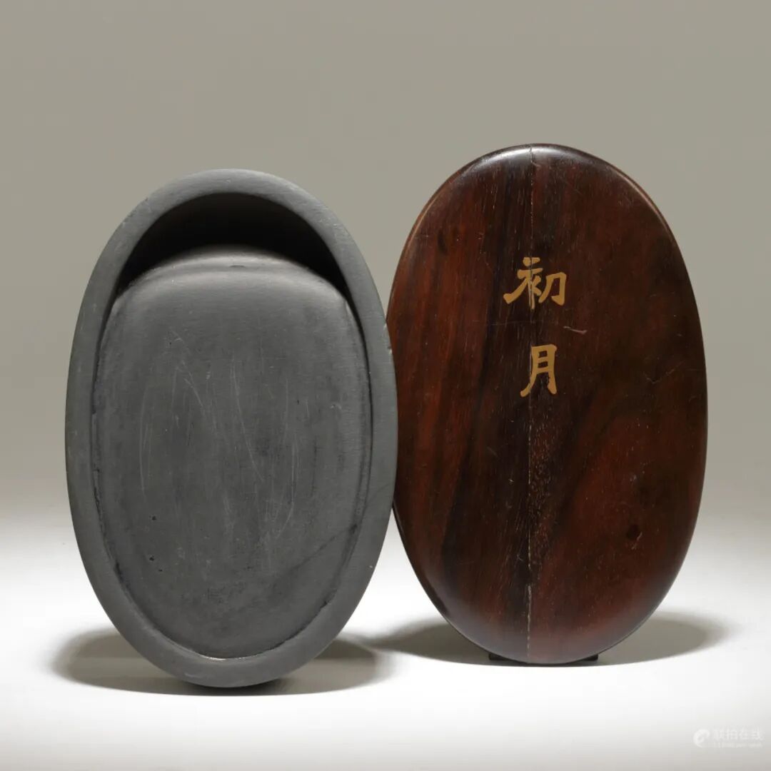 拍品简介:砚作椭圆式,砚面光素平整,墨池状如海月初升。砚首壁镌楷书:“仿汉未央砖海天初月砚”十字。砚背正平镌清高宗御题铭一首,楷书:“海天初月升于水,素华朗照清莫比,酂侯之砖曾无此,谁与题名难议拟,翰筵静用实佳矣,抽思启秘有若是。”款题:“乾隆御铭”。《钦定四库全书西清砚谱》卷二十四,页三六,载“仿汉未央砖海天初月砚”与此形制、砚铭相同。另参阅《西清砚谱古砚特展》,台北,1997年,图版89号。此首御题诗收录于《清高宗御制诗文全集》,第十册,御制文二集,卷三十九(图一)。