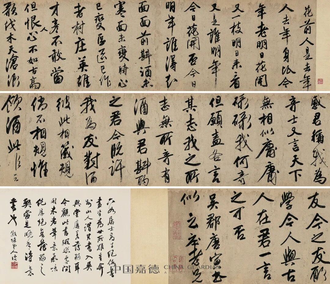 此卷书自作诗,诗意放达,任越不拘,在世情冷落之中,表达了对知己的感恩之情。直白如口号民歌,但却是真性情的流露。其书法也以雄直取胜,酣畅痛快,写的亦是心声。
