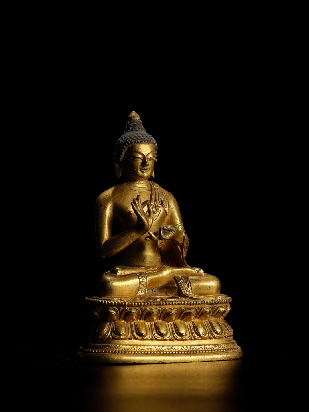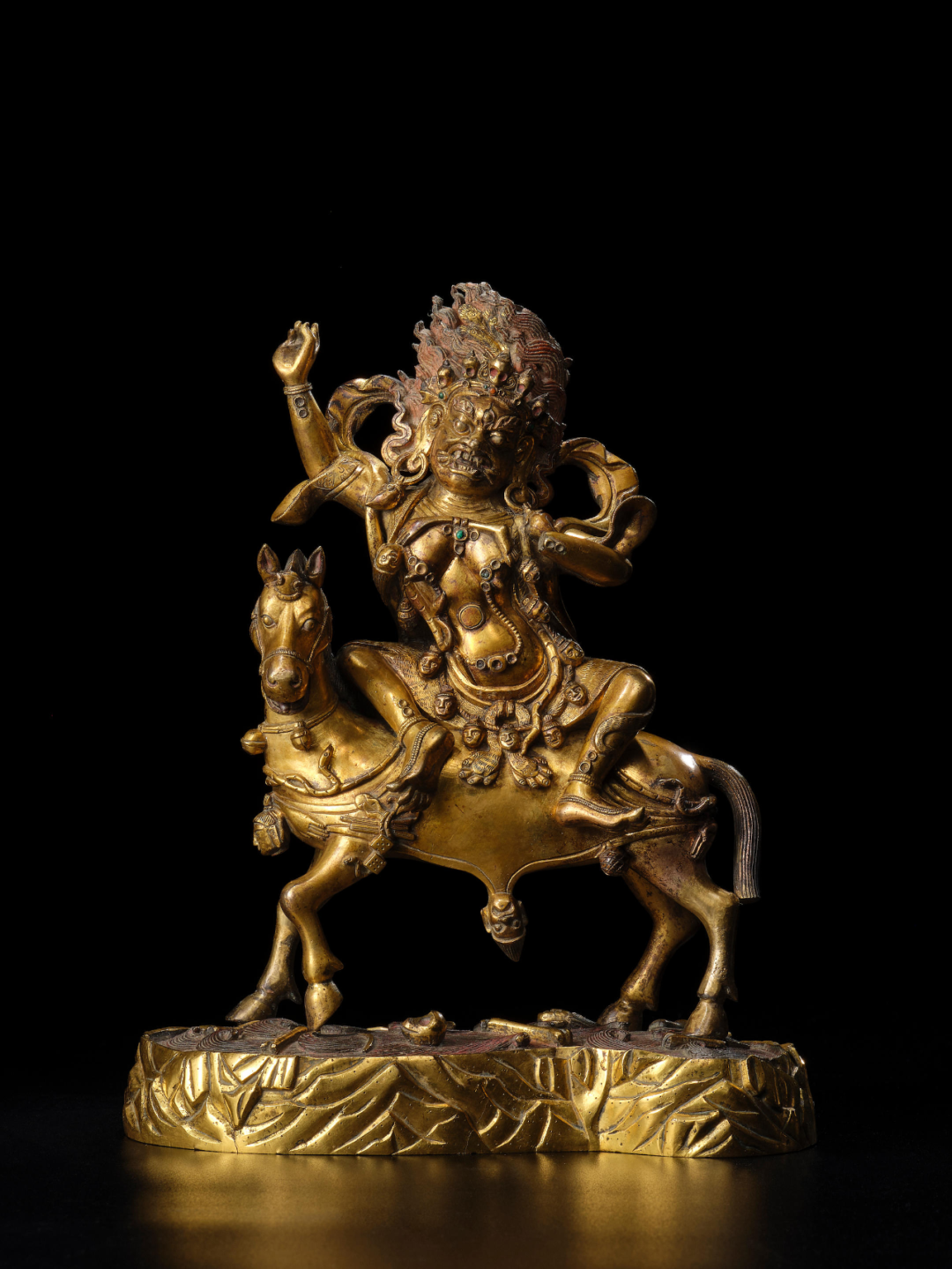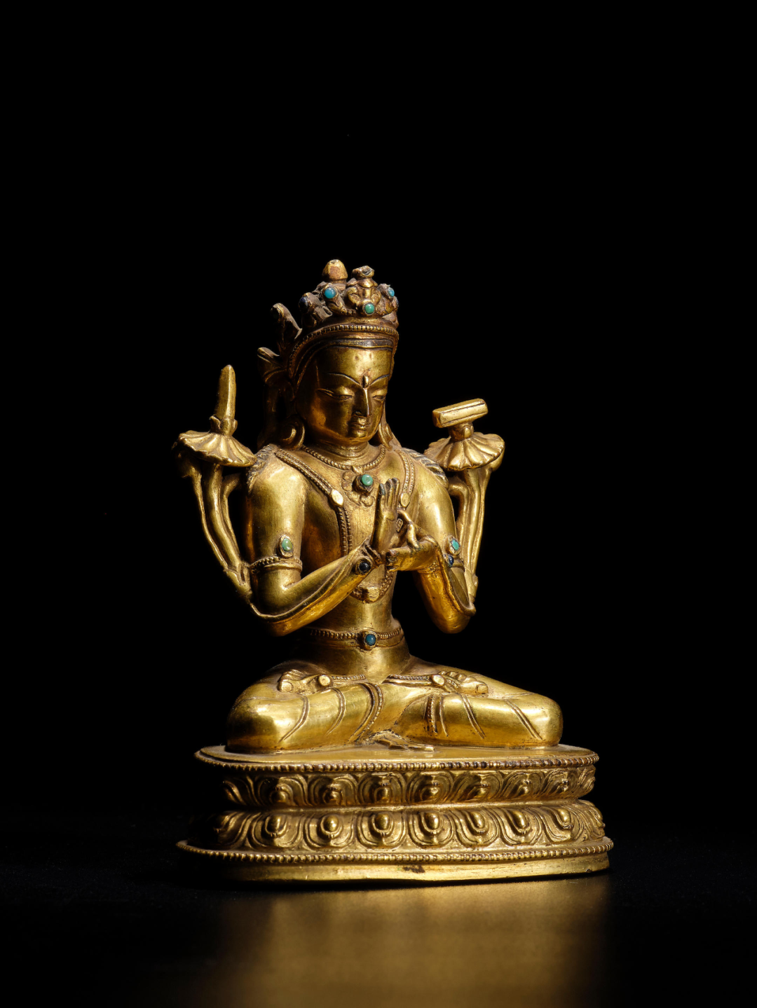 著录:Arman Neven,《Le tantrisme dans l’art et la pensée》,1974年,页76,编号390展览:Le tantrisme dans l’art et la pensee, Palais de Beaux-Arts,布鲁塞尔,1974年3月7日至4月10日来源:克劳德·德·马图珍藏,布鲁塞尔,二十世纪七十年代前入藏明初宫廷对藏传佛教极为热忱,尤以永乐与宣德为最。其时施造之鎏金铜像,輝煌奪目,风格鲜明,堪称中国藏传佛教艺术的一座巅峰。喜金刚为密宗无上瑜伽续之重要本尊,其十六只手臂顺势展开,各持嘎巴拉碗,一侧盛象征八疾之八种动物,另一侧则有八位神祇,对应脱离各疾病之苦,栩栩如生。其明妃为无我佛母,为众佛之母般若波罗蜜多菩萨之密宗形象。主尊与明妃起舞,瓔珞翻飛,瑰丽而磅礴,赐予安康与富足。這座奪目的造像之比例、身形及瓔珞裝飾等皆為宣德風格,無比貴重。主尊身後亦有二尊跪拜小像,柔和端莊,並不常見。![]()