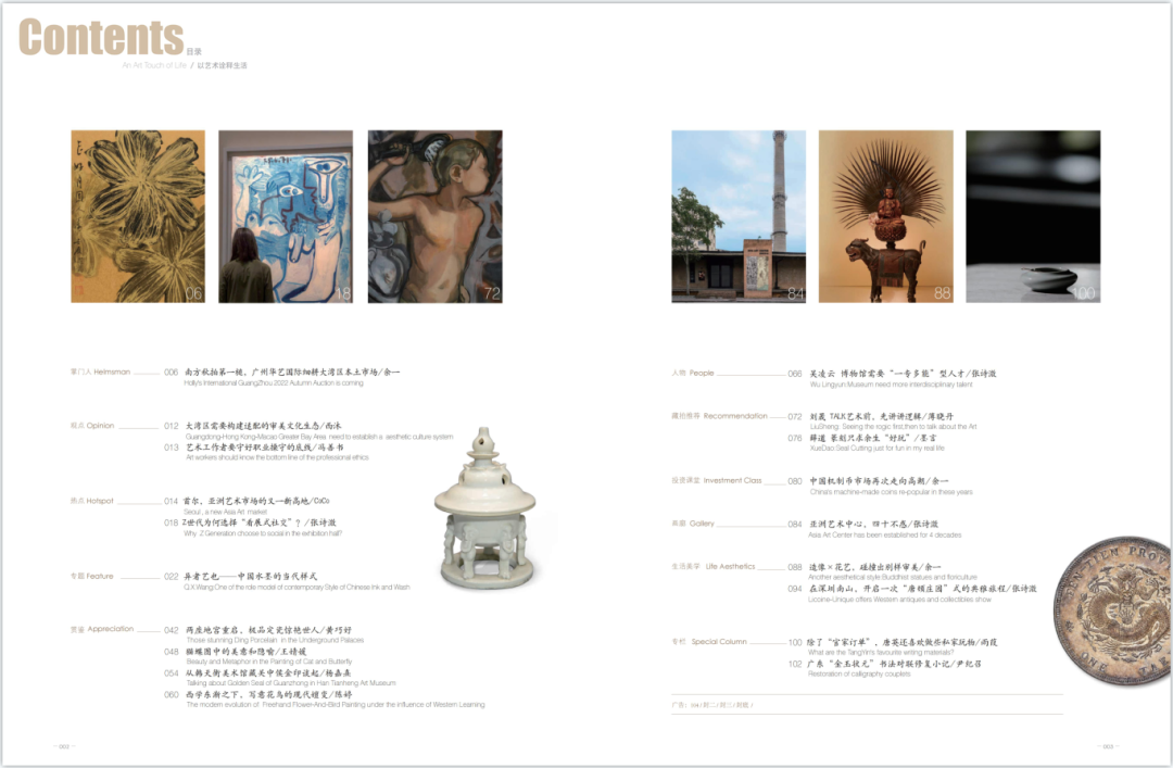 2022年国庆前夕,第二届粤港澳大湾区文化艺术节圆满落幕,再次向世人展示了“湾区人文新活力”。作为中国人均GDP最高,经济实力最强的地区之一,大湾区的经济与科技发展的先进示范作用已毋庸赘述,但同时亟待明确是其先进文化示范区的身份与地位。历史已一再证明,一个没有文化精神与区域精神特征的地域,即使其经济与科技再发展,也是缺失灵魂与发展方向的,是没有前途、难以持续的。近些年,文化作为国际竞争中的软实力,日益得到国家战略层面的重视。如《学习纲要》中所说的 :“文化越来越成为民族凝聚力和创造力的重要源泉、越来越成为综合国力竞争的重要因素、越来越成为经济社会发展的重要支撑,谁占据了文化发展的制高点,谁拥有强大的文化软实力,谁就能够在激烈的国际竞争中赢得主动、占得先机。”近现代以来,南粤之地一直是中国连接世界、特别是东南亚地区的桥头堡,随着粤港澳大湾区战略的实施,这一地位与作用更加凸显。作为国家未来战略发展的重点区域,其文化体系与生态的构建便显得尤为重要了。正如本期《观点》栏目中,中国艺术经济研究院院长西沐教授所提出的——大湾区需要构建适配的审美文化生态。“这是由其战略发展目标及定位所决定的,建立与培育相适配的审美文化,是粤港澳大湾区文艺发展的基础,也是粤港澳大湾区文化建设及文化精神培育的基础,更是在新时期粤港澳大湾区经济政治社会发展的重要战略选择。”这也给大湾区本土相关的艺术文化产业、机构提出了课题,在本期的人物专访中,大家也给出了各自的思考与答案。广州博物馆吴凌云馆长提出,“博物馆是一个城市的人文精神坐标”“广州要更好地建设‘博物馆之城’,就要努力实现博物馆均衡化布局、特色化建设”;广东拍卖行业的代表、华艺国际副总裁王力也谈到,“文化需要示范效应”今后广州团队要做更多市场的引领、培育工作……文化产业是慢热型领域,需要长时间的投入与陪伴,更需要大家的集思广益、凝心聚力,在整个生态链中扮演好各自的角色,才能协同、合力打造出一个真正具有先进文化示范作用的大湾区。