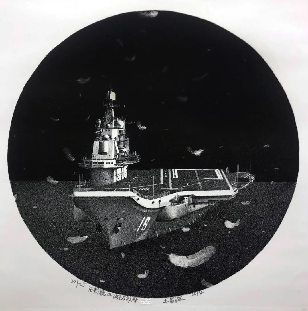 王昌淦运用一种制造静态感的石版画技法来呈现快速消费的信息内容。他所选择的题材均为时事内容:钓鱼岛、转基因、马航失联客机等。但他以静止和凝固的手法处理这些题材,使得事件像是静物般冻结在画面当中。石版画独特的肌理效果让这些本来尖锐的事件顿时披上了温柔的外衣。细腻丰富的灰层次提炼出一个无比大的自由空间,像是黑洞,把一件件充满争议的事件吸入并消解。王昌淦把时事内容的速度感抹去,让它们像是尘埃般慢慢沉寂下来,从而给画面带来“历史感”,让画面内容成为真正的“历史之镜”。