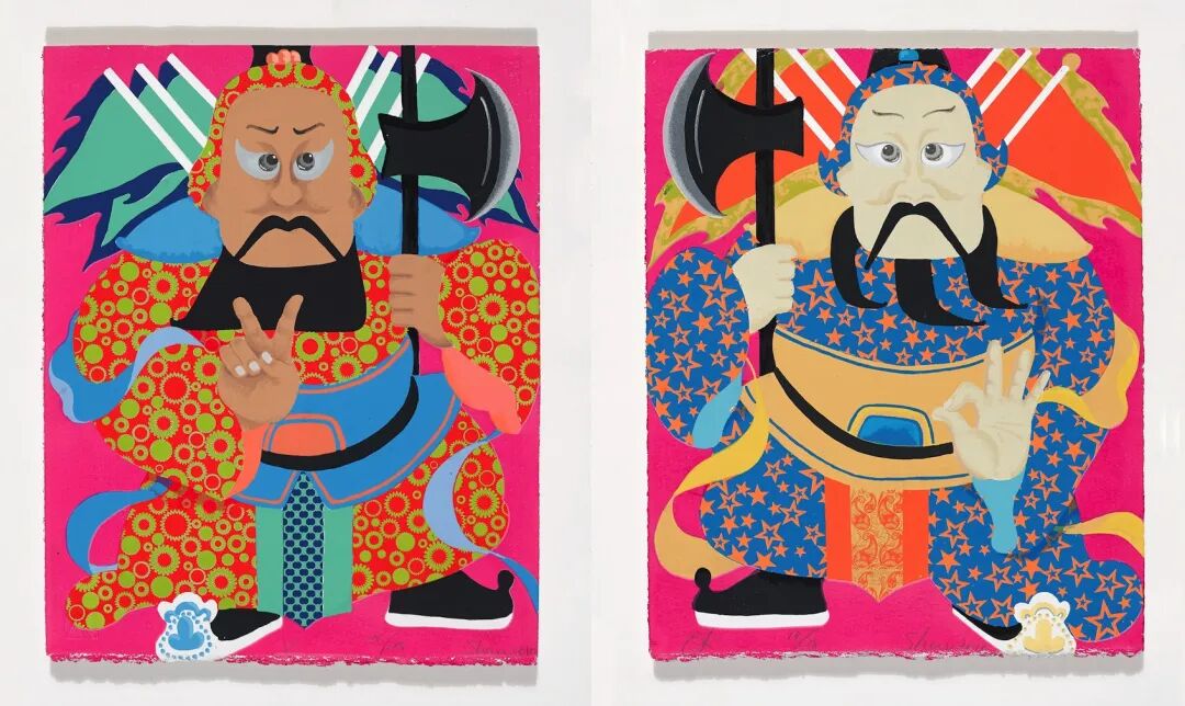 我大学时专业是中国画,很痴迷描摹古画上那些纹饰繁复的衣袂,沥粉堆金的发簪,悱恻缠绵的飘带,为古中国矫饰却明媚,荼蘼也坦荡的富贵深深折服。毕业的时候我应聘修缮北京大观园游廊彩绘的画工,因为学历过高被拒,加之我以为现世是如此地与这可供浓墨重彩笔落金朱的华丽古意背道而驰,就没有更多地做下去。一直到后来经营丝网工作室,因为有巨量品质极高的小尺幅法国画纸,又近年尾,便随手做了这对门神,本意也就是节下探亲访友聊博一笑。为此在古风的基础上又故意做得夸张加了好些时髦点缀,成了中西古今糅杂的样子。