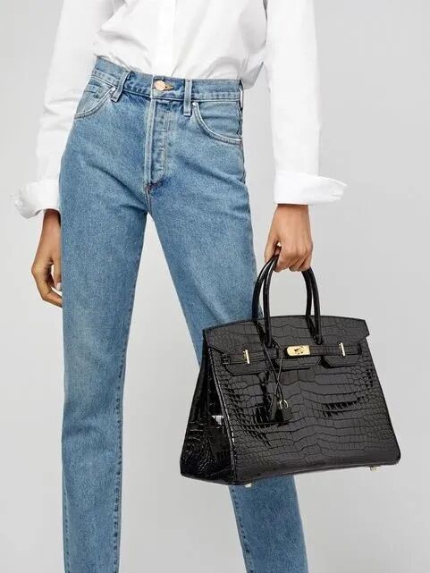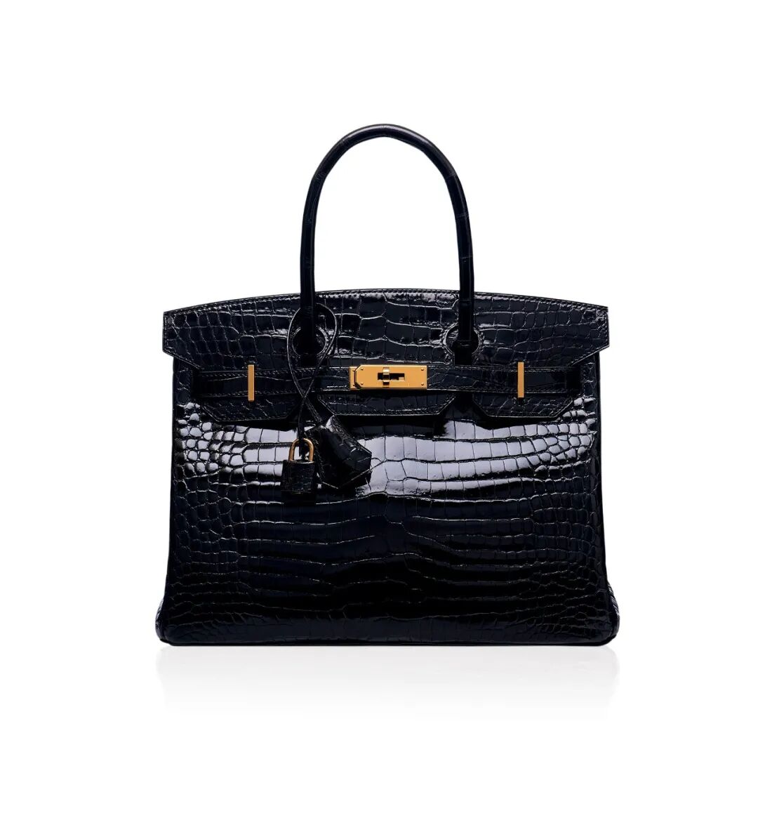 亮面黑色 POROSUS 鳄鱼皮 30 公分柏金包附金色金属配件
