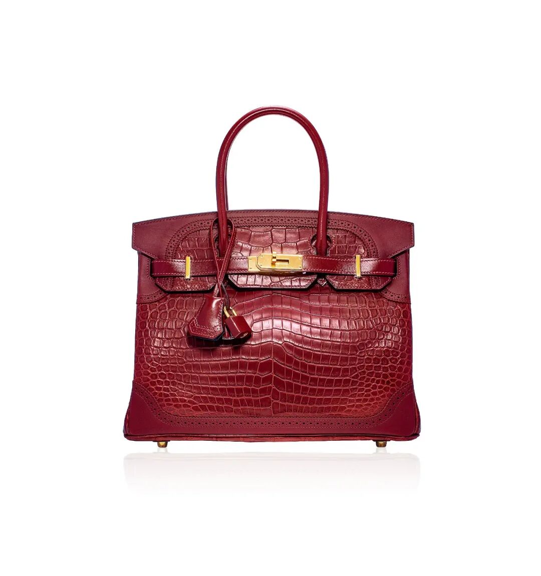 限量版雾面勃艮第酒红色 POROSUS 鳄鱼皮、爱马仕红色 SWIFT 牛皮及宝石蓝色 30 公分 GHILLIES 柏金包附金色金属配件
