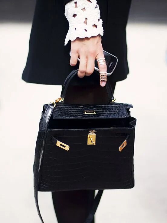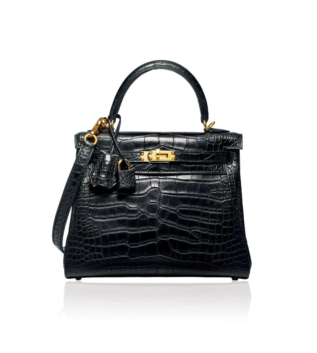 雾面黑色短吻鳄鱼皮 25 公分内缝凯莉包附金色金属配件