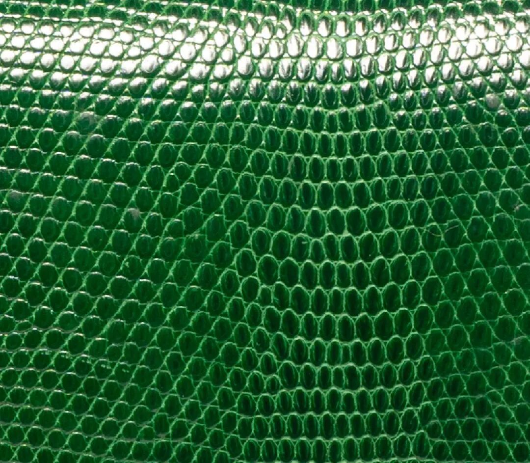 一般蜥蜴皮,主要来源于东南亚,蜥蜴皮小鳞片排列规则精致,斑纹纤细,表面经过增光加工,且富有光泽。