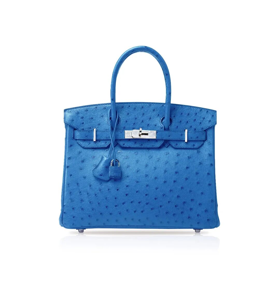 米克诺斯蓝色鸵鸟皮 30 公分柏金包附银色金属配件
