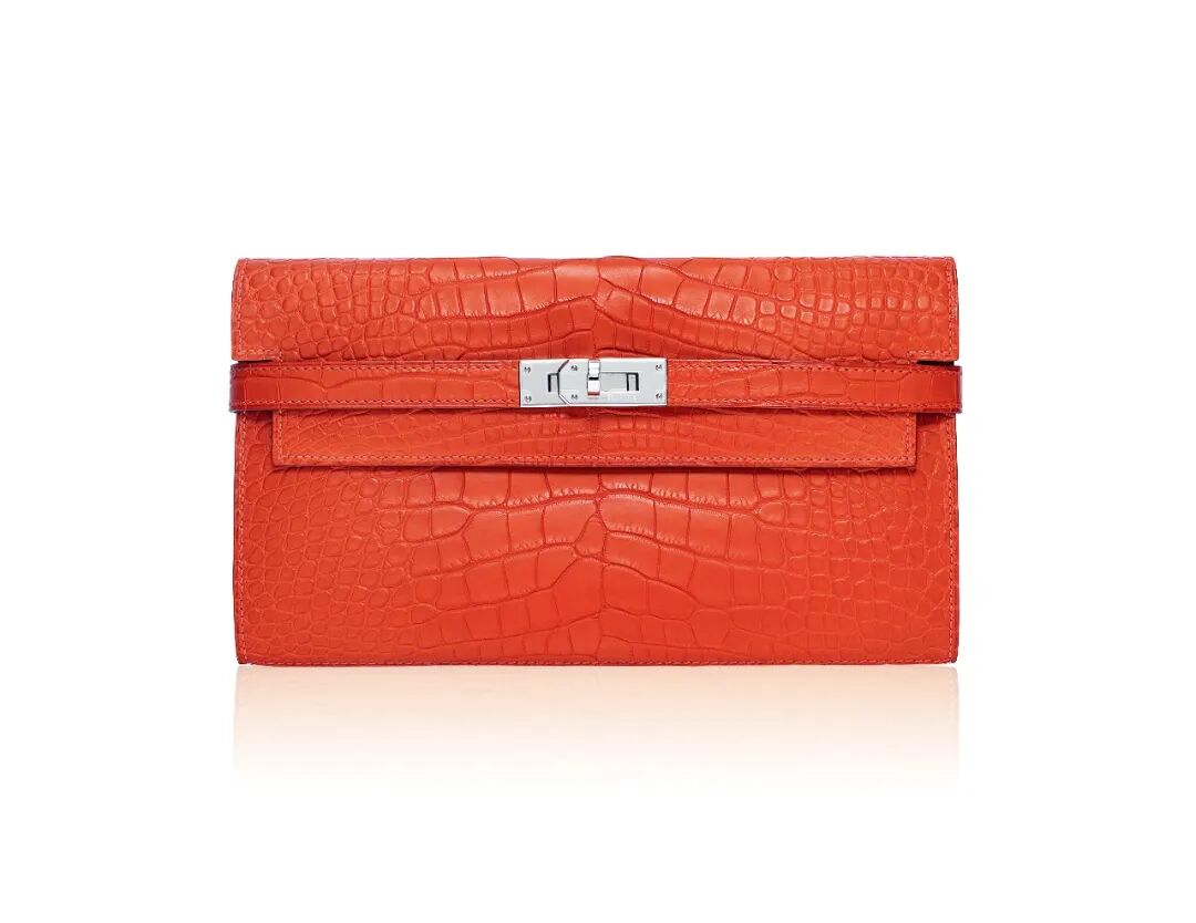 雾面火焰橙色短吻鳄鱼皮 KELLY 皮夹附银色金属配件