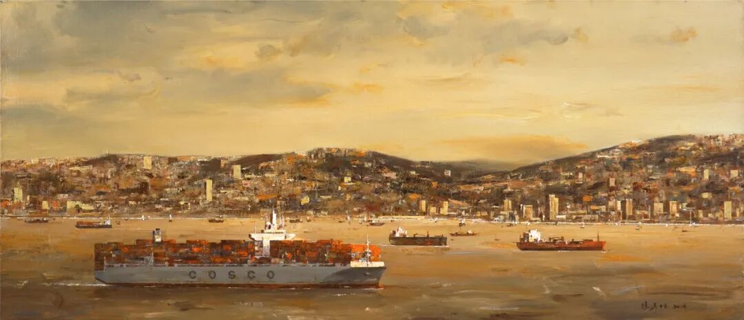 冯少协《智利瓦帕莱索港——中国货轮》 油画 63cm×150cm 2019年
