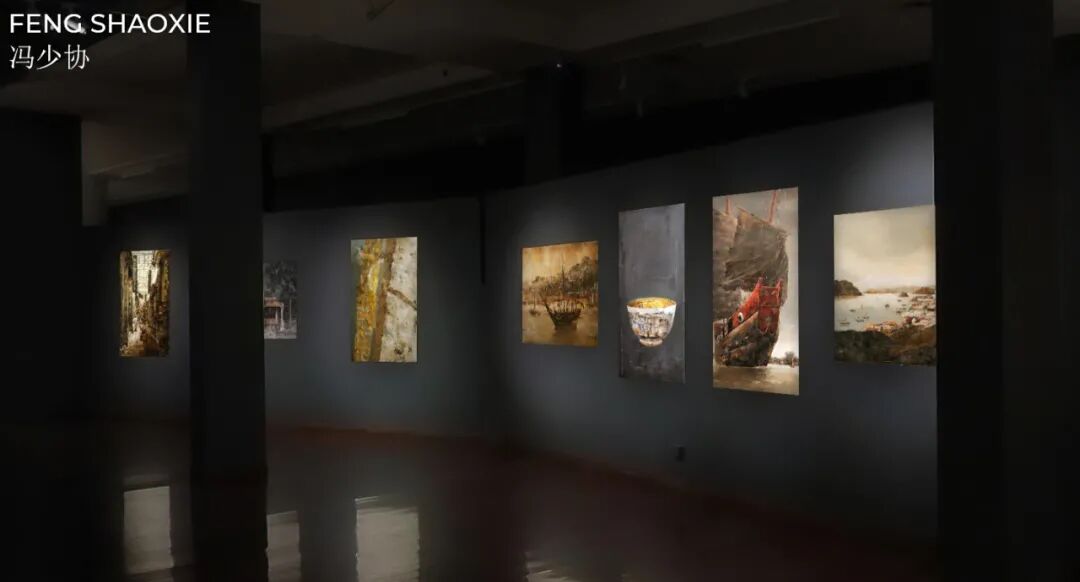 其中,此次展览中展出的《海上丝绸之路》的创作源于2013年。习近平主席提出共建“丝绸之路经济带”和“21世纪海上丝绸之路”的倡议,为了响应这一宏大倡议,寻找古代海上丝路的文化印记,冯少协与广州日报社联手合作,倾注全部精力、心血投入“海上丝绸之路”大型油画系列的创作。这一系列作品从表现秦汉时期的黄埔古港起步,一直到以艺术的形式表现“21世纪海上丝绸之路”的美好前景,时间跨度长达两千余年;其次,这一系列作品再现的遗迹遗存分布广阔,从广州、海南岛,至泰国、马来西亚,再至斯里兰卡、印度,终至土耳其、好望角乃至威尼斯,几乎囊括了昔日海上丝路的所有重要节点,空间跨度前所未有。
