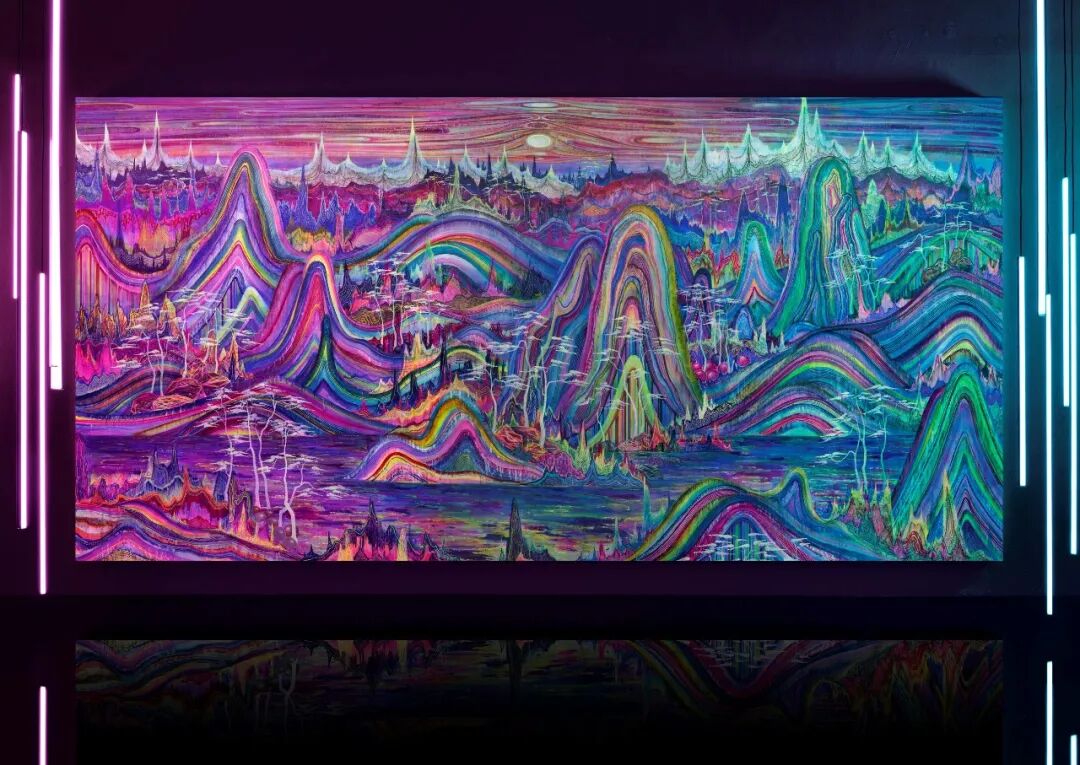 中国艺术家黄宇兴的《万疆》则回归中国传统,以现实主义技法“工笔重彩”为基础,巧妙地运合霓虹色彩来重构一幅当代人眼中的“山水”巨制。