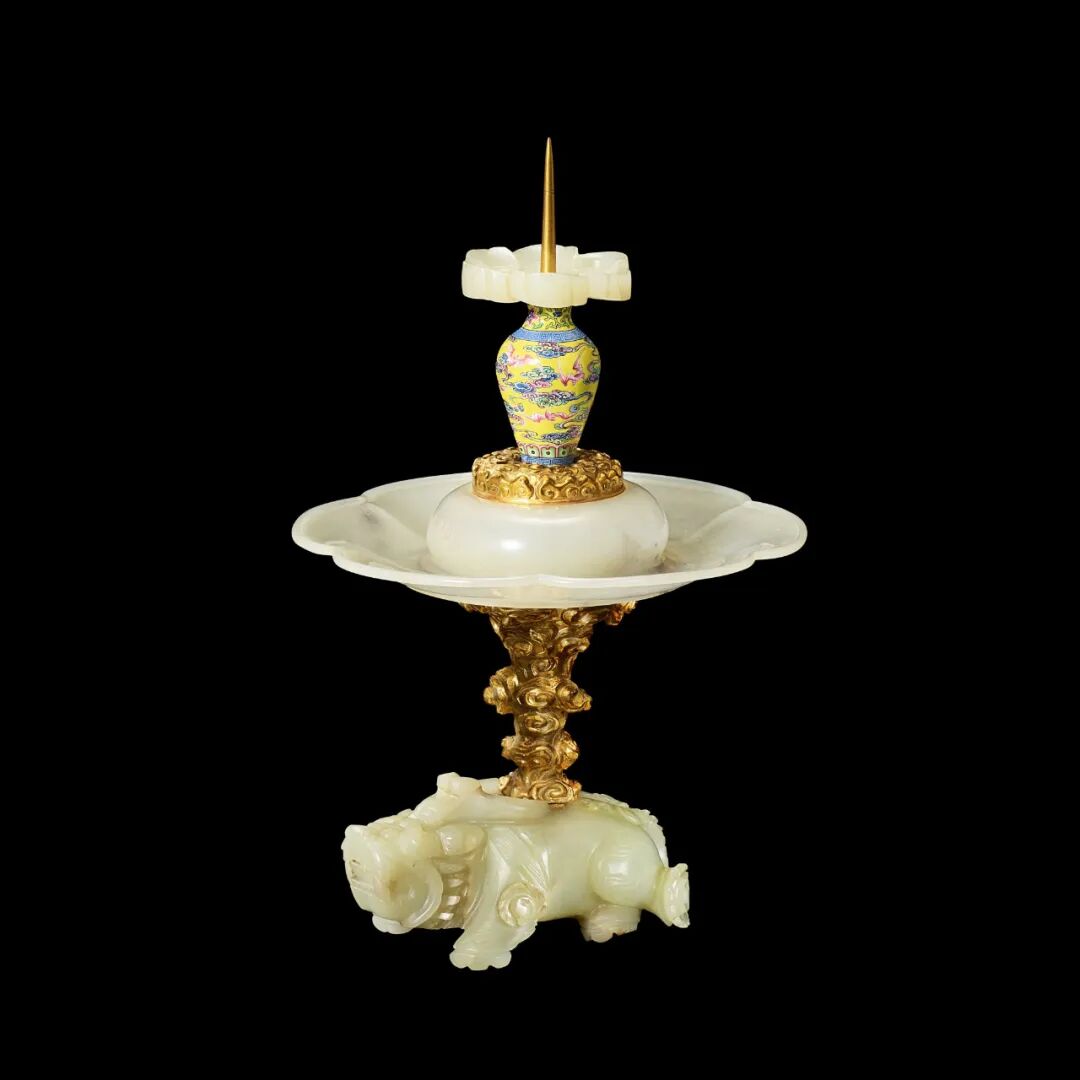 清乾隆 御制白玉嵌北京铜胎画珐琅烛台
