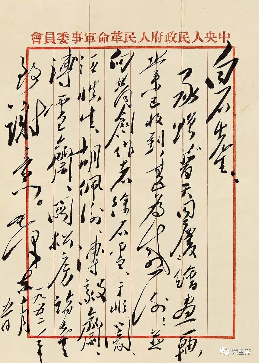 释文:白石先生:承赠《普天同庆》绘画一轴,业已收到,甚为感谢!并向共同创作者徐石雪、于非闇、汪慎生、胡佩衡、溥毅斋、溥雪斋、关松房诸先生致谢意。毛泽东一九五二年十月五日
