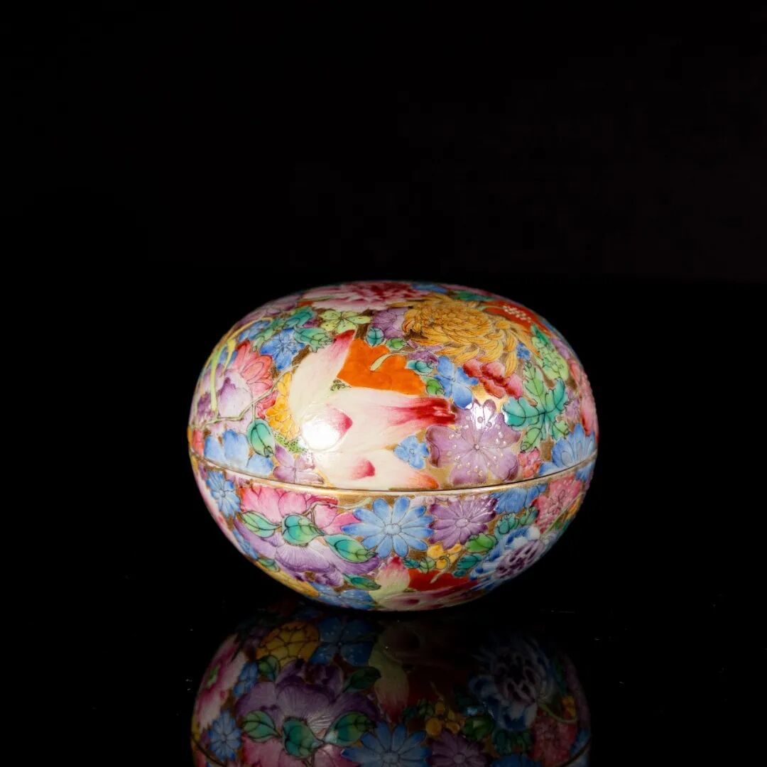 盒为圆鼓形,子母口,卧足,造型饱满圆润,内施白釉,外为金地,其上布饰荷花、牡丹、菊花、栀子等各色花卉,描绘精细入微,色彩绚丽多姿。底以蓝料书“大清乾隆年制”六字三行篆书款。整器玲珑俊雅,绘工精湛,不失为案头赏玩佳品。