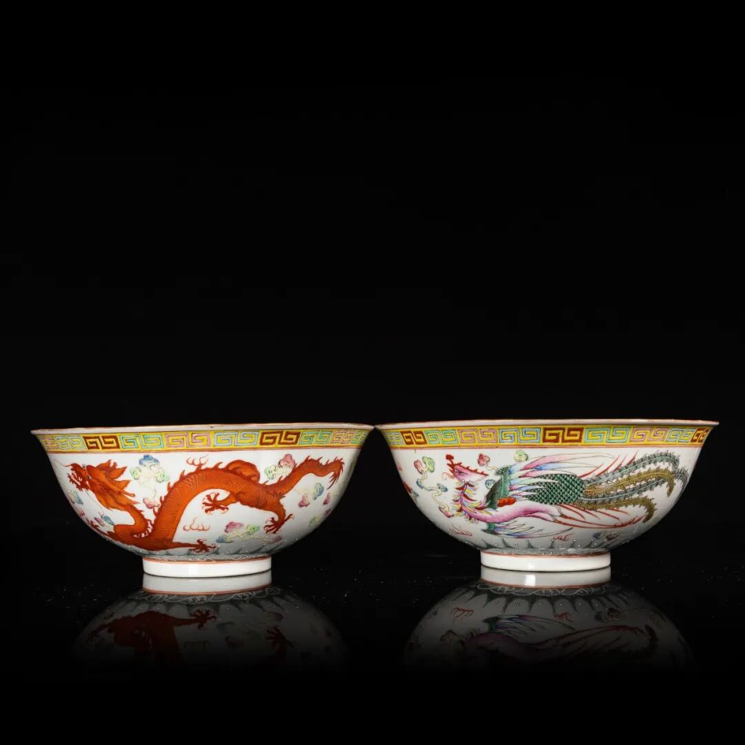 本碗碗型周正,尺寸较大,胎质细腻,外壁主题纹样绘粉彩龙凤赶珠纹,龙纹主要以矾红彩绘画,姿态矫健,在淡雅的粉彩祥云中,突显威严。晚清民国时期,官窑御作鲜有精品,本品应为当时绘画、制作皆精的作品之一。