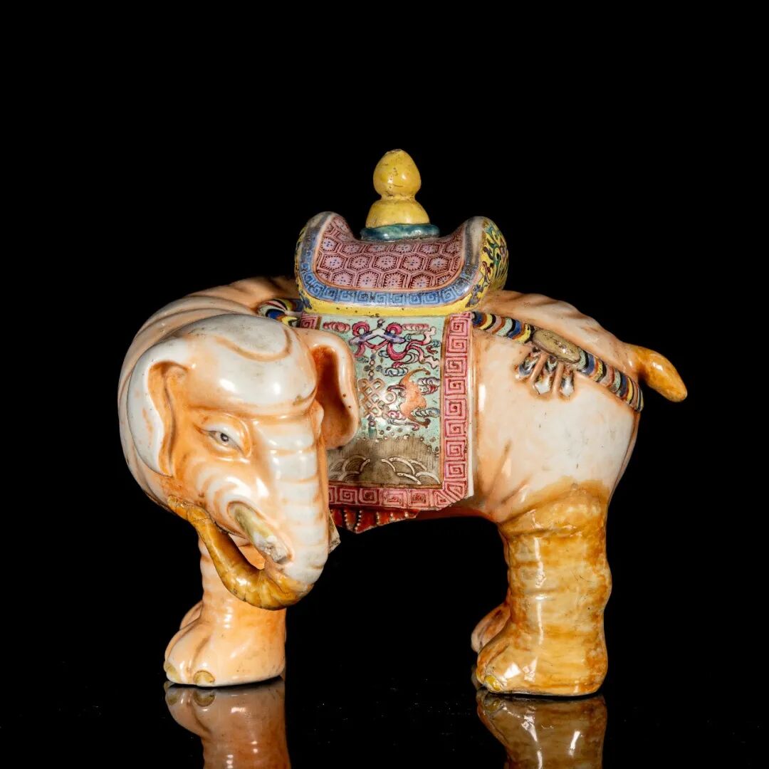 胎体厚重的白色象生瓷塑象,背驮粉彩黄地底的吉庆宝瓶与中空的象身相连。白象四肢直立,作回首俯视,尾巴摆动状;长鼻卷曲,象牙洁白自然、耳朵自然下垂血脉清晰逼真,两眼炯炯有神;其力大魁威、性灵柔顺初见就让你感到亲近而喜悦。白象身上是堆塑的腹带披搭,元宝型的鞍座等。粉彩绘制的腹带珊瑚红珠和藏传佛教绶带,寓意为“九贡”财丰物博。披搭以绿彩为底边,两边以粉彩绘福庆如意,祥云盘绕。清宫内务府造办处档案记载:乾隆皇帝曾多次下旨烧造各类瓷塑。元宝型的鞍垫上安放的吉瓶尊,黄色为底象征皇家、皇朝、皇帝。整器造型华贵别致,寓意祥瑞吉庆,生动地表达了对太平盛世、国泰民安的赞颂。