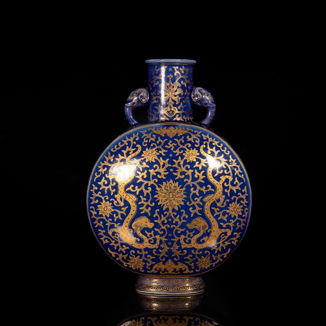 此瓶唇口,短颈,颈、肩处饰对称象耳,扁圆腹,椭圆形圈足,为仿明永乐造型,清宫称其为马挂瓶。外壁施霁蓝釉,其上以描金装饰,饰宝相花和缠枝莲纹,双立龙雄硕遒劲,姿态威猛,金彩保存完好,用彩浓厚。此瓶既可作为典雅的陈设瓷器,亦属上品花器,供插花之用,一如清宫旧藏《嘉庆行乐图》所绘釉里红扁壶,置于庭院案桌之上,插以春花二枝,逸致毕现。