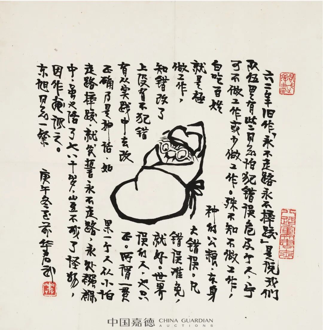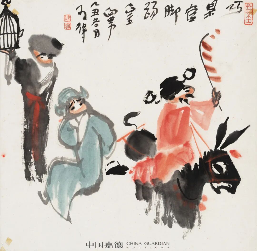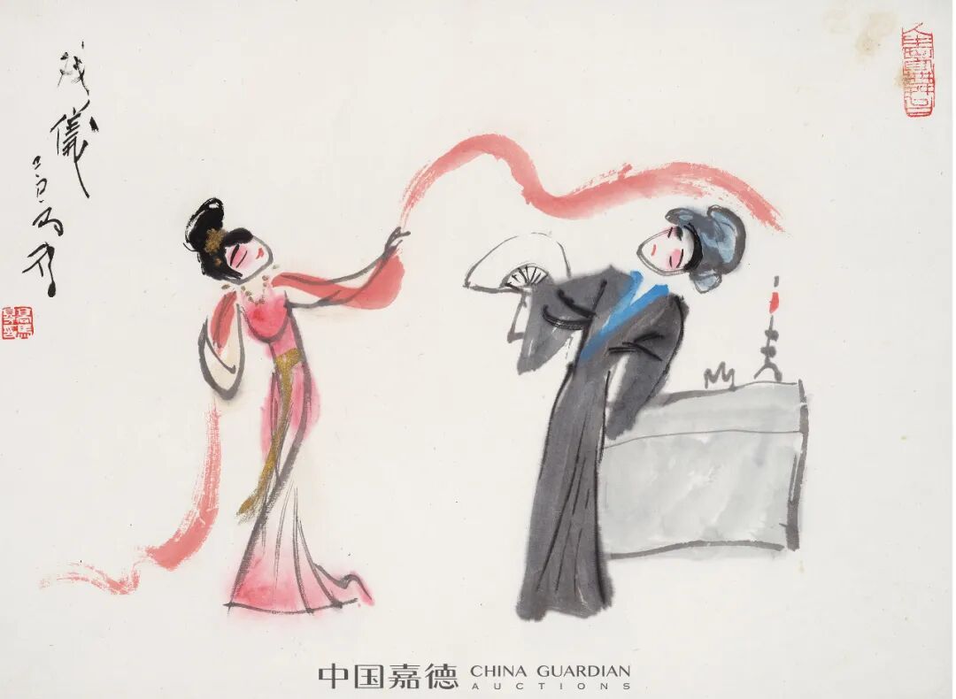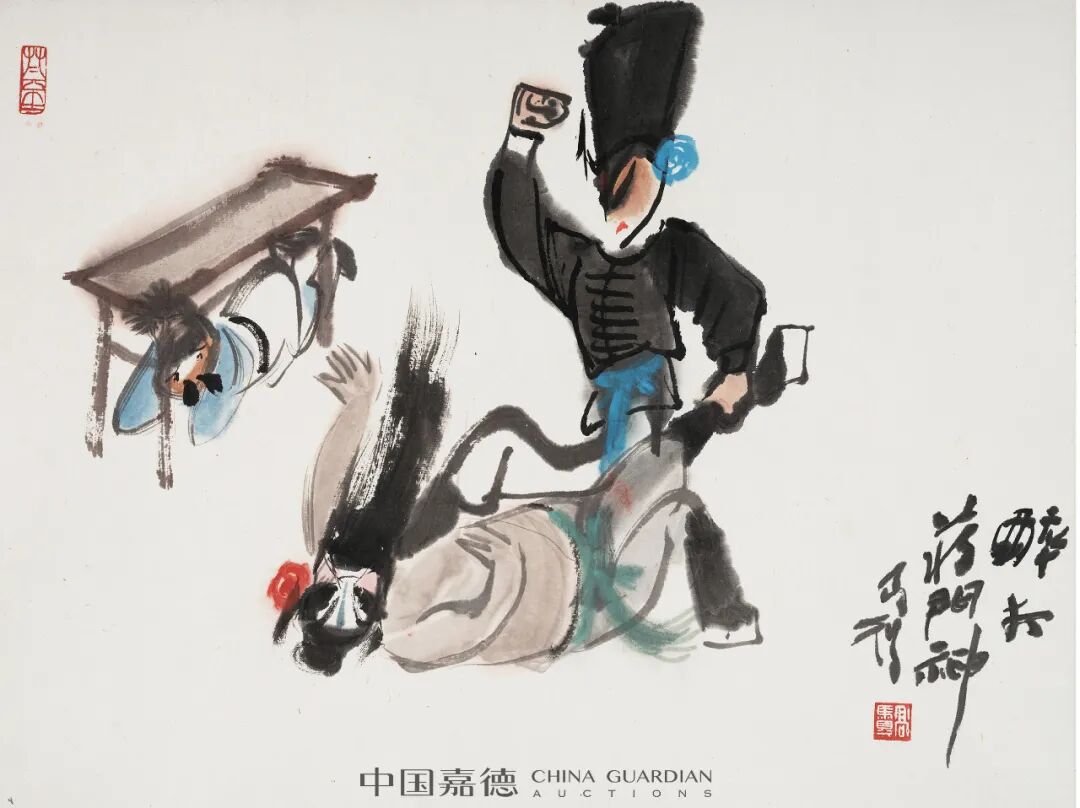 “笔底漫妙”专题中集合了高马得、韩羽、蔡志忠、丁聪、华君武等一批名家之作上拍。他们或以漫画形式绘社会现实,人间世事,或以漫画笔意绘历史故事、戏曲唱段。画面虽小但透辟世事,寥寥几笔但横墨竖彩。在高马得的笔下,漫画的夸张变形与水墨写意巧妙融合,戏剧情节里那些矛盾冲突、悲欢喜乐,经画家的巧手由此便有条不紊地转放在水墨之中。蔡志忠、丁聪、华君武等的艺术家的漫画作品则是更加通俗幽默,在雅俗共赏的图文中不失深刻思考。