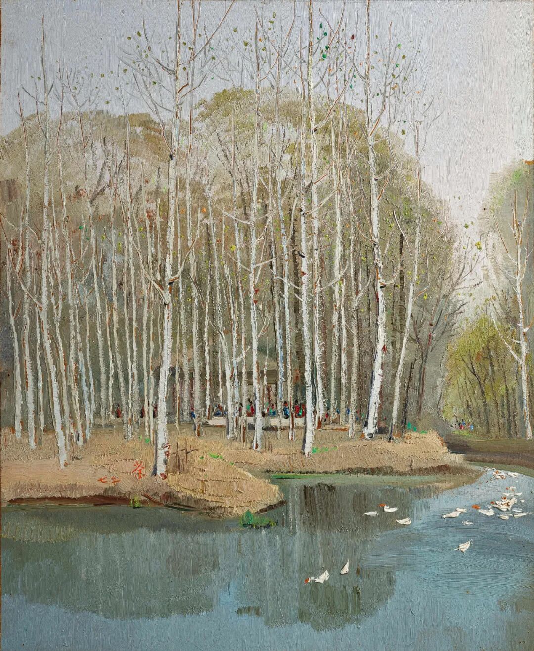 一九七二年,吴冠中在河北省下放期间,重获绘画自由。虽然绘画条件艰苦,物资匮乏,但这并阻挡不了艺术家压抑已久的创作渴望。《达活泉》画中岸边挺拔的白杨树,河中欢快的鸭鹅,无不描绘出一幅冬去春来,万物复苏的景象,反映出艺术家重获创作自由时内心欣欣向荣的真挚感情。