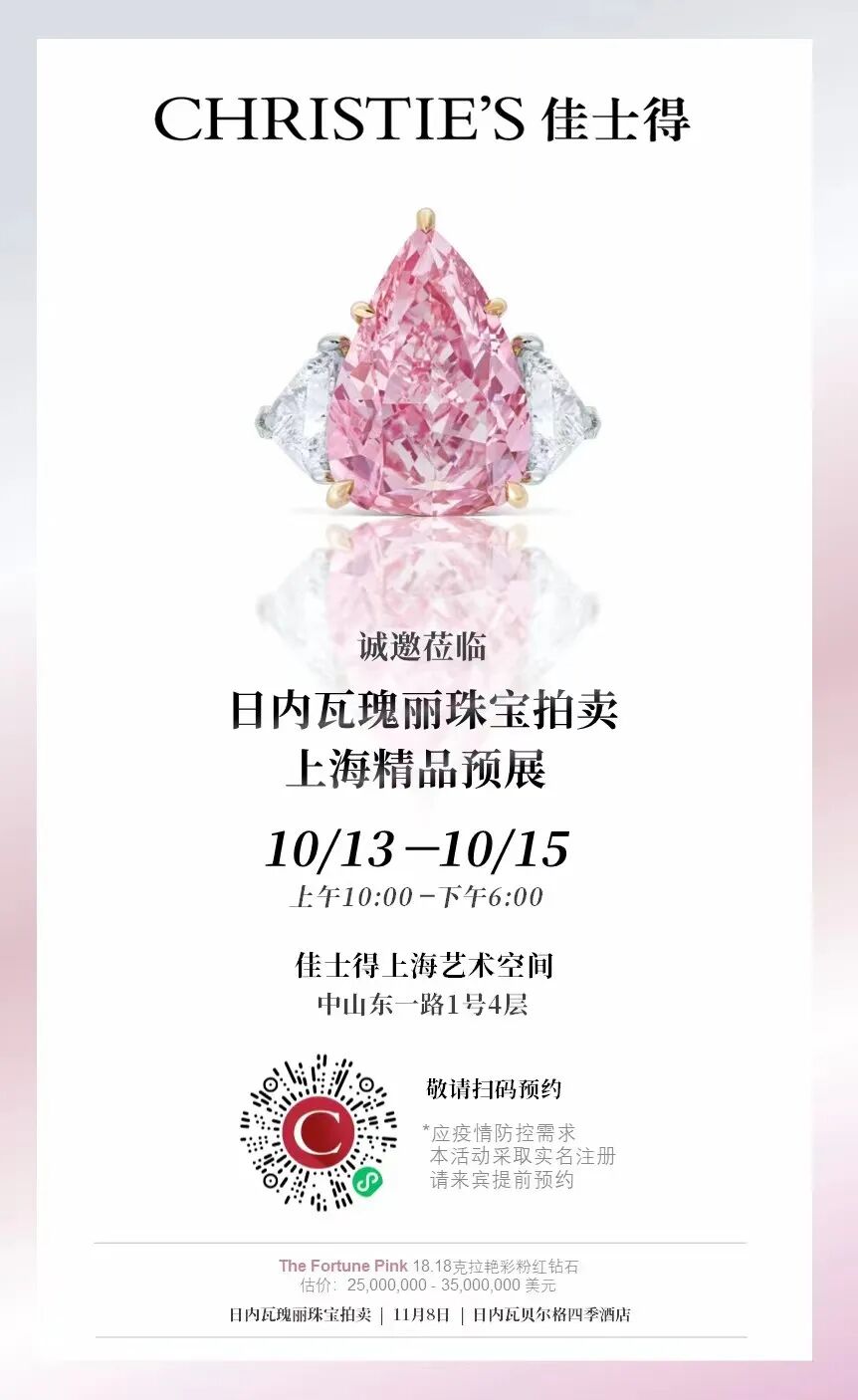 与此同时,10月13至15日同时亮相上海预展现场的还有一场美轮美奂的日内瓦瑰丽珠宝拍卖精品预展,领衔之作、一颗重达18.18克拉的梨形艳彩粉红钻石“The FortunePink”亦将璀璨亮相预展现场。![]()