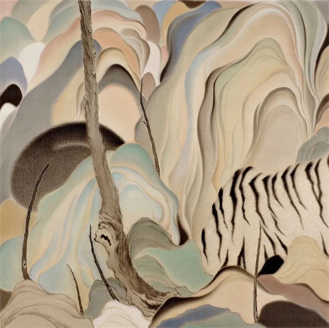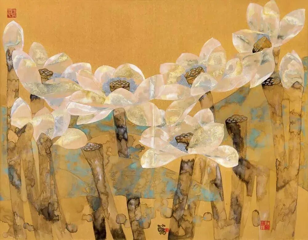 用金色作底,用墨的层层晕化凸显事物肌理,再回归传统画法,构建精巧布局。