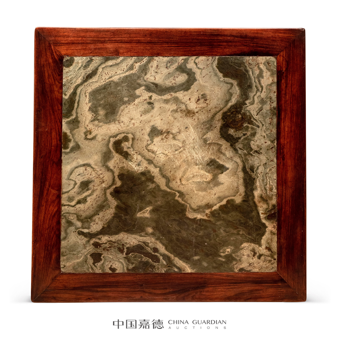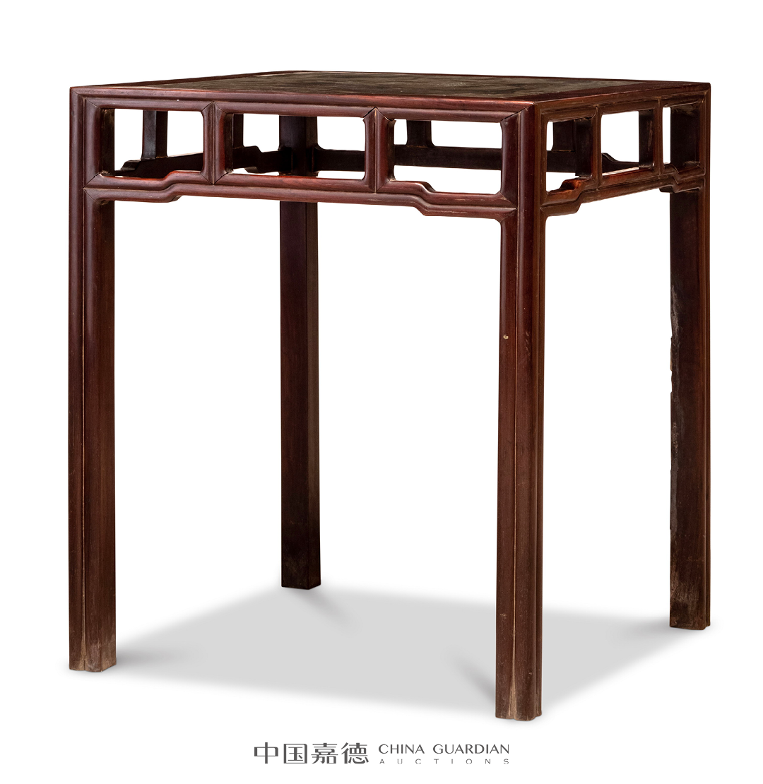 方桌红木制,四面平式,格角攒边镶嵌云石面心,以粽角榫与四腿足相交,腿足间安罗锅枨,每面枨上安两矮老,边抹、横枨、腿足及矮老均中部打洼,劈料作,制造一种仿竹效果。