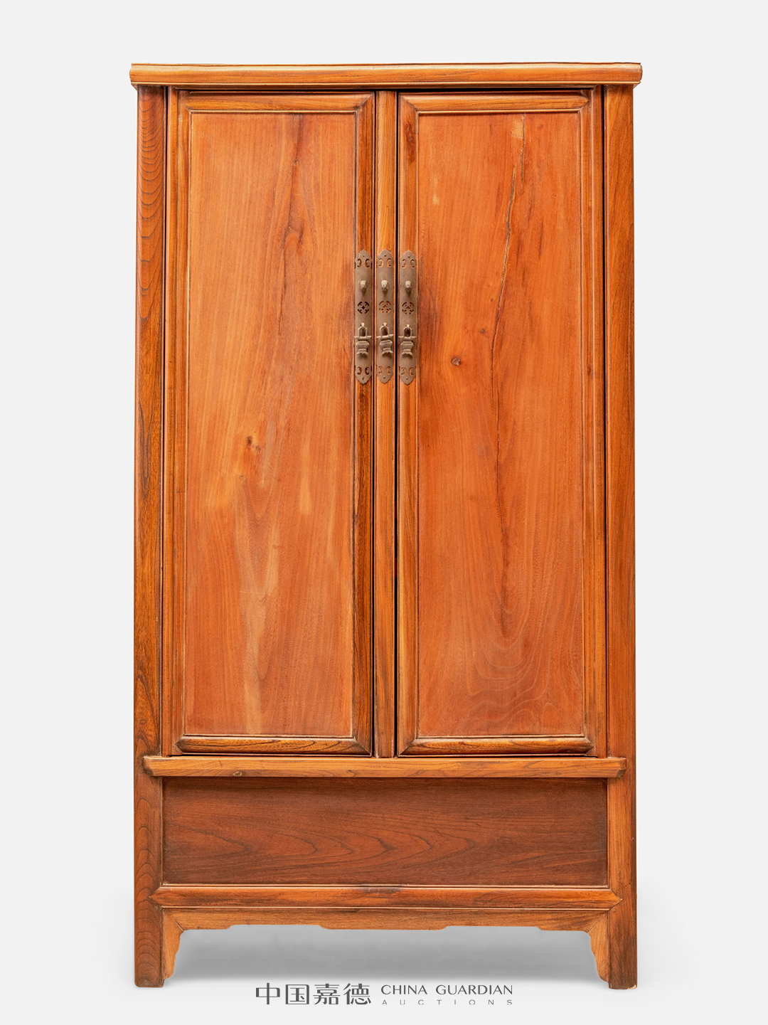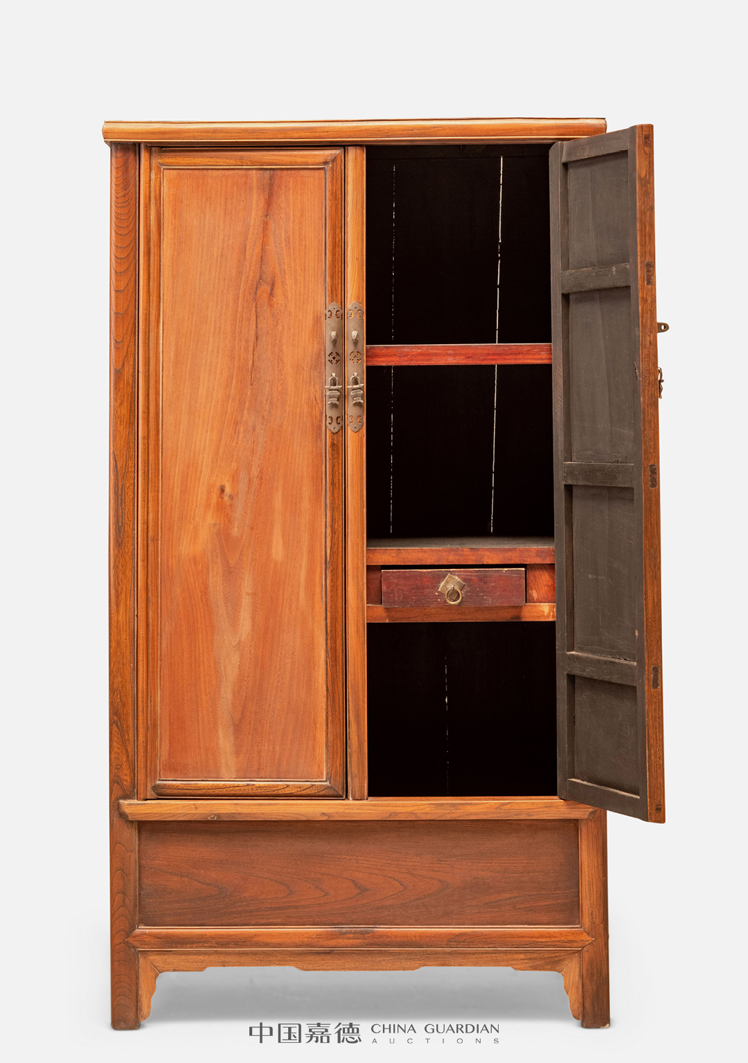 圆角柜榉木制,设闩杆,有柜膛。帽檐喷出,四根腿足纳入柜顶边框,柜门攒边打槽装独板板心,设镂空如意云头纹面叶,花篮形吊牌,可上锁。内部设三层空间,第二层隔板下设抽屉两具,便于储物。柜膛设于柜子下部,两侧及背面由延长的柜帮板及后背板构成,正面另安独板柜膛立墙,装入两根枨子及两足的槽口内,腿足间装错落起伏的刀牙板。