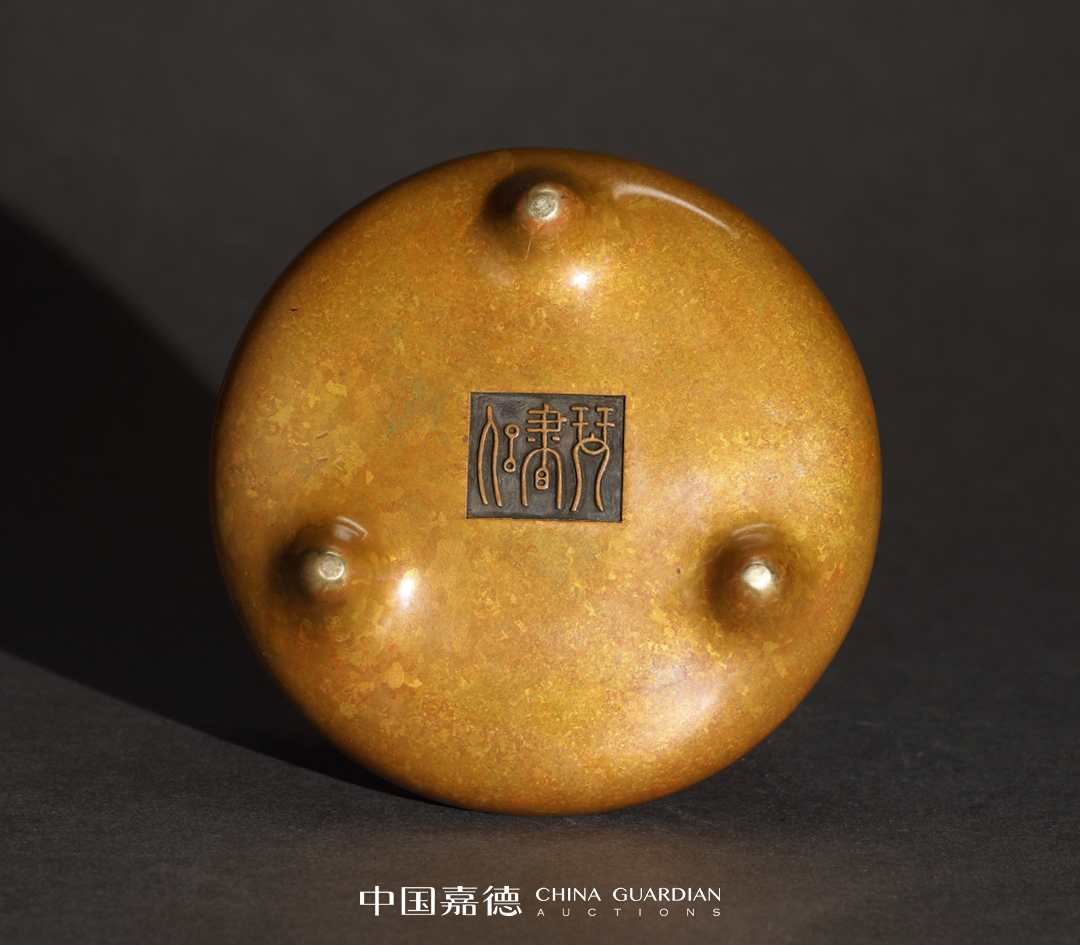铜炉冲耳朝天,圆健有力,口沿宽平,扁圆形腹,弧形敛收,口腹曼妙,底承三乳状足。减地阳文法镌篆书“琴书侣”款。精铜为材,入手敦厚,藏经纸色,质似黄金,皮壳润厚,隐亮含光,静而不嚣。