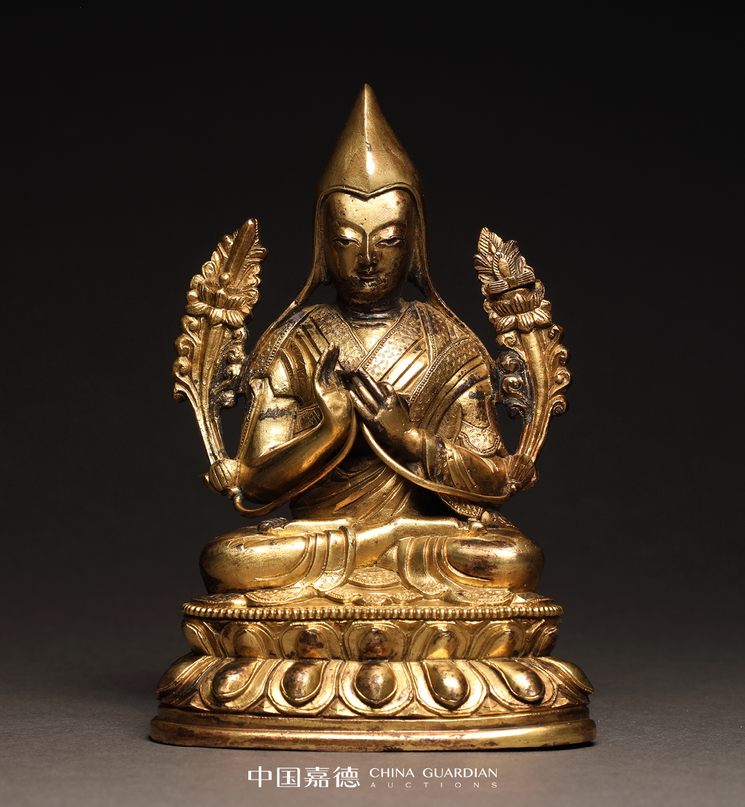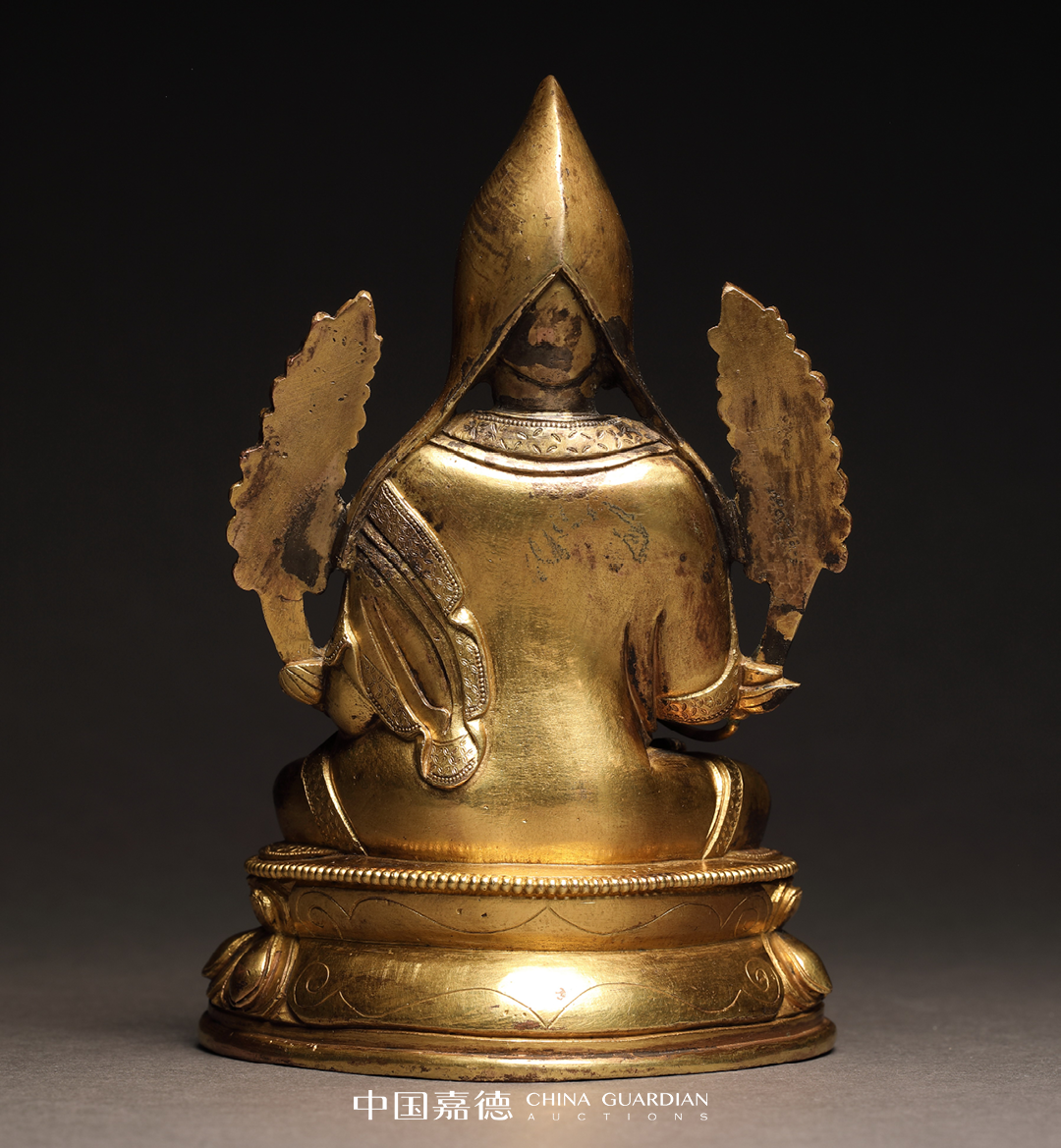 宗喀巴是藏传佛教格鲁派的创立者,译言“善慧称”。造像头戴通人冠,面形丰满自然,双目微睁,面相沉静,神态宁静慈和,身着袒右肩式袈裟,内穿交领式僧衣,这是西藏僧人的典型装束。衣纹刻划厚重写实,衣领及袖口边缘处均錾刻有清晰的花纹带,造像底部錾刻十字金刚杵,造像通体鎏金,保存完好,华美异常。