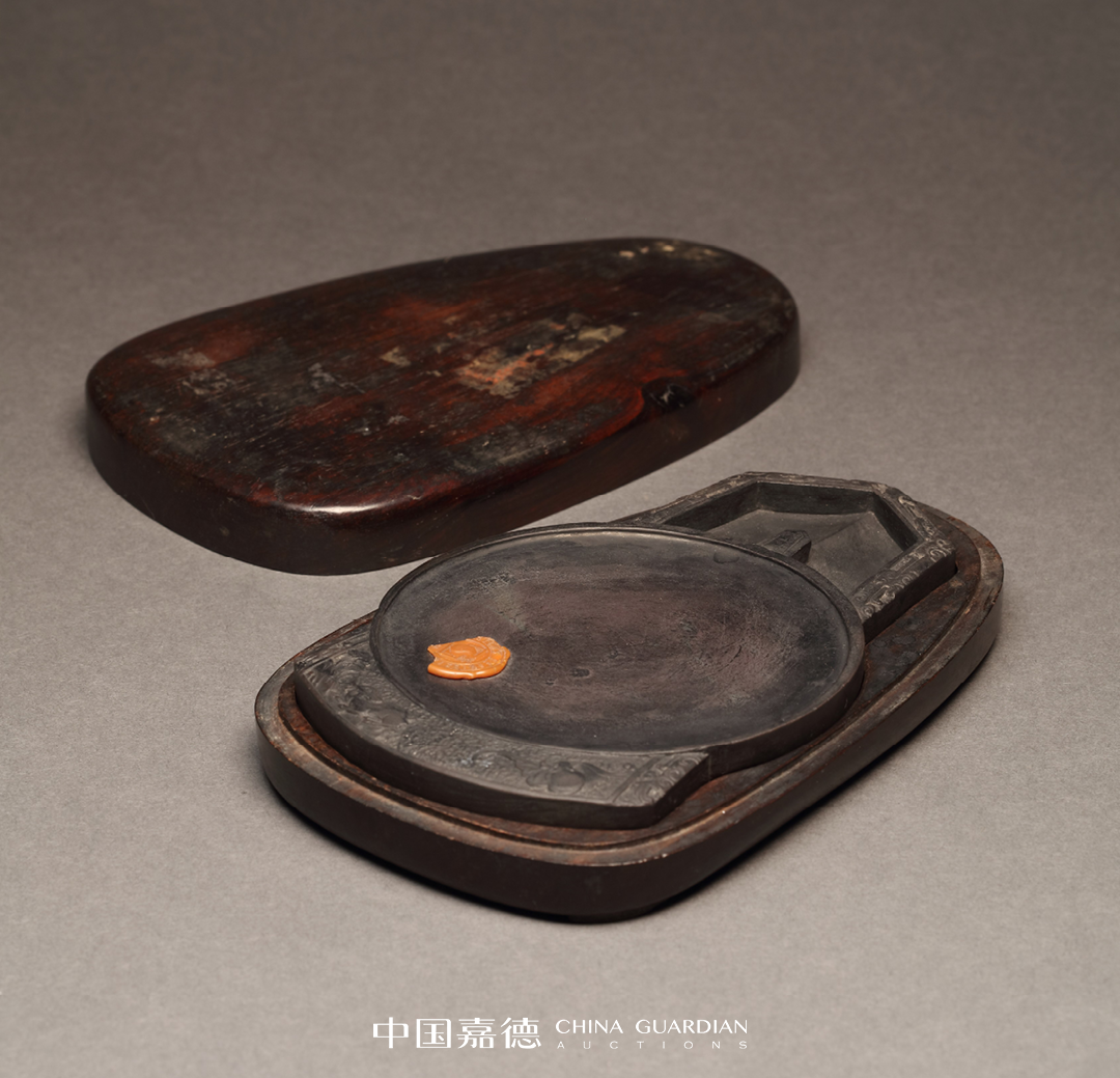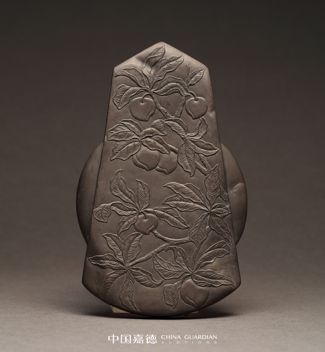圭璧形端砚,墨池深泽,边缘刻云气纹,圆形砚堂,底部刻蝠、鹿、灵芝纹饰,取福禄寿之吉祥之意。砚背纹饰精彩,桃树枝叶繁茂,掩映仙桃六枚,果实圆润,疏朗有致,刻工精湛,叶脉木纹清晰灵动,宛如一幅工笔水墨。整砚保存完好,砚堂有火漆,颇为难得。