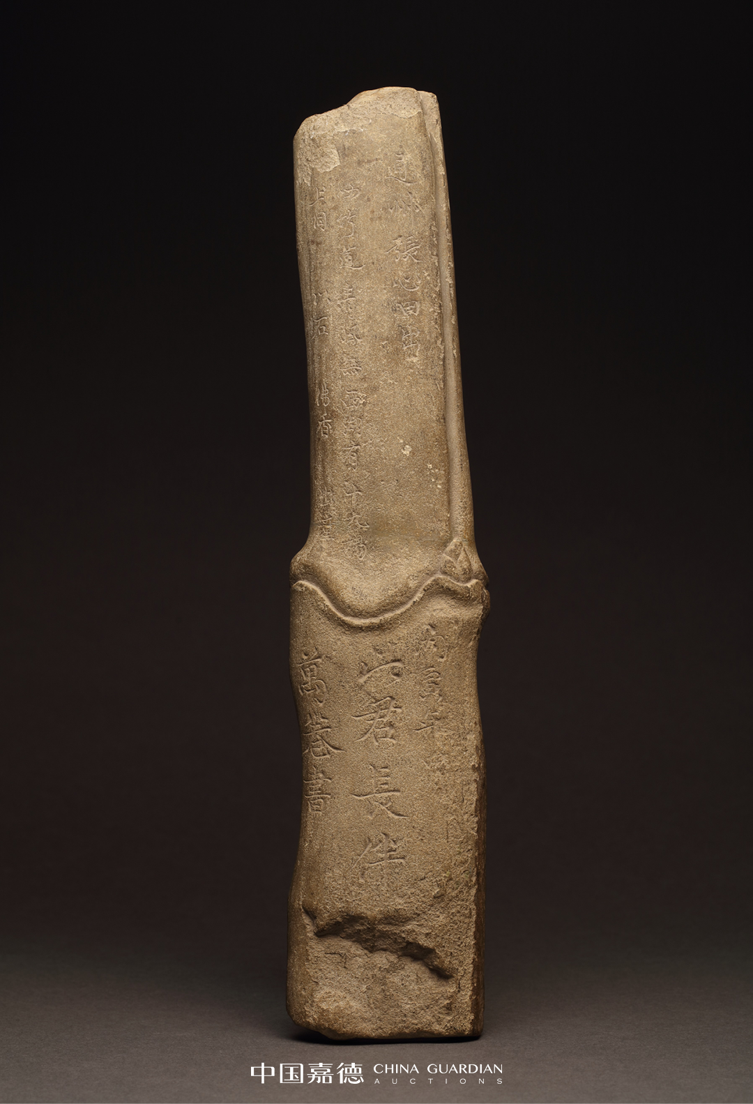 仿竹节状砂石镇尺,劈竹为器,略弯向一侧,中部有节,上下均阴刻文字,“此君长伴万卷书”,背面为竹剖面,打磨平整,可做案头镇尺。砂石颜色古朴自然,以苍劲竹节为形,更显文人风骨。