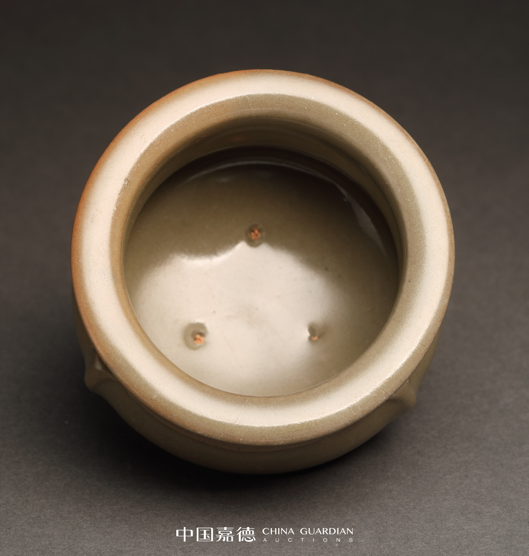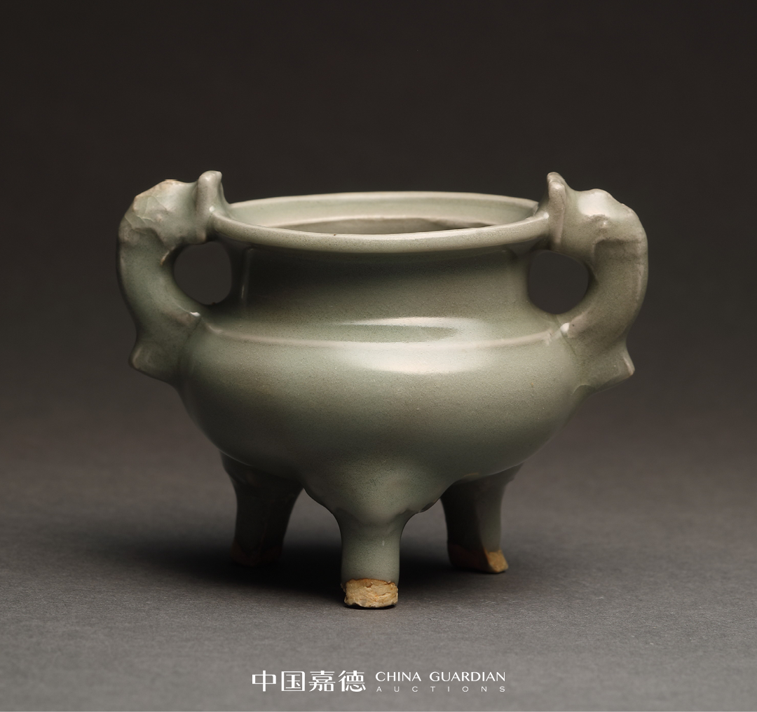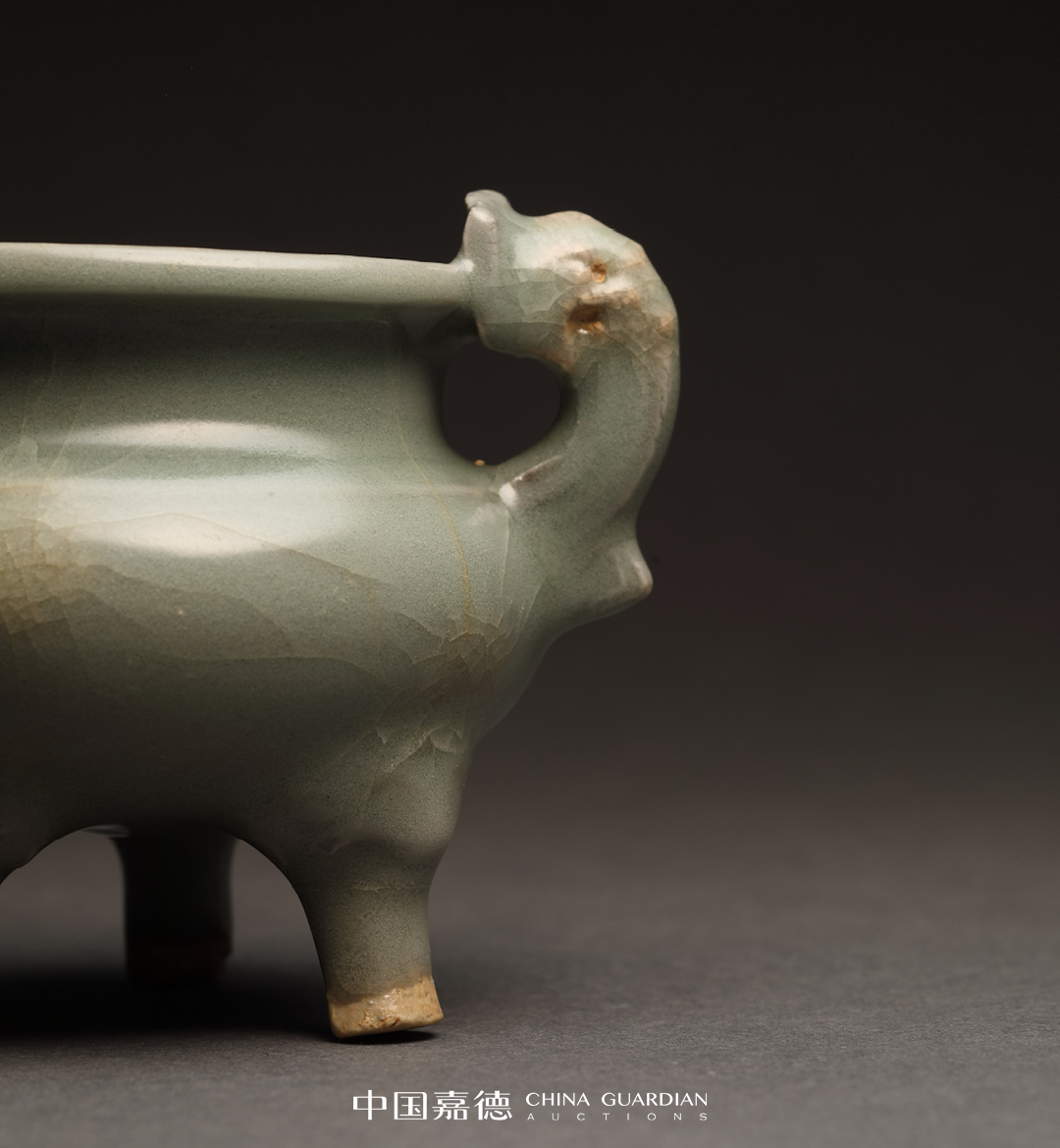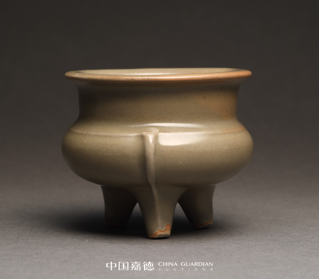 此炉折沿,高束颈,扁弧腹,下承三外撇式柱足。肩部及腹部对应三足出筋明显,为典型仿青铜器制式。足端露胎处可见胎体灰白,并泛浓重火石红色。通体施龙泉青釉,釉色粉沉穆内敛。整器造型挺拔秀逸,釉质温润如玉,宝光内敛,不失为一件龙泉窑香席陈设佳品。