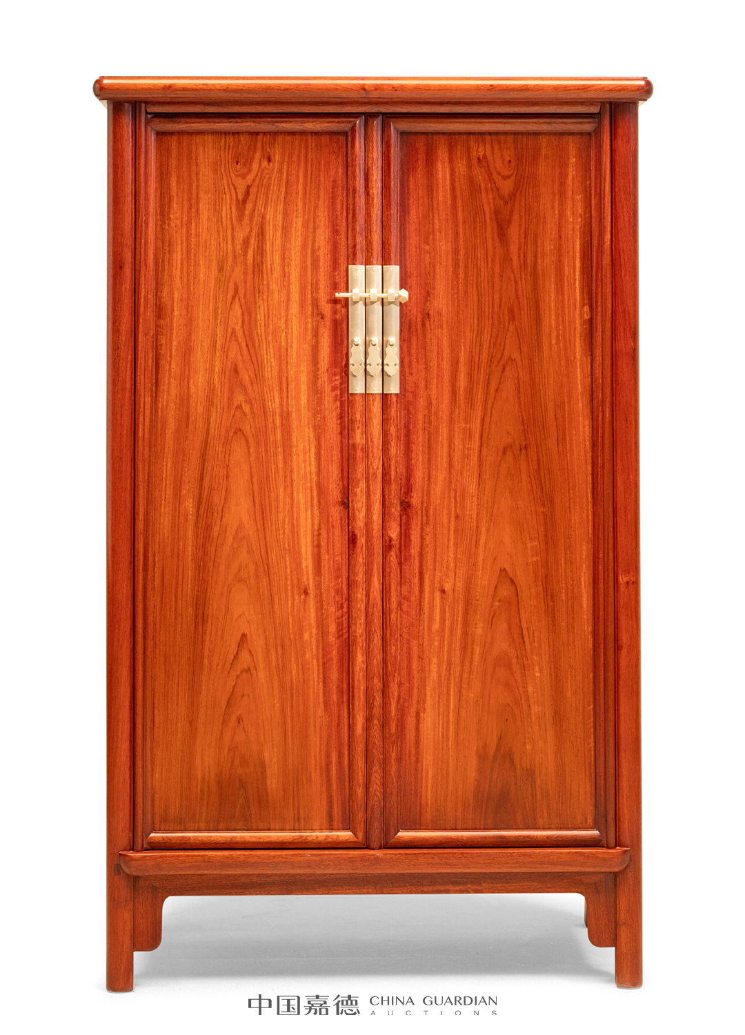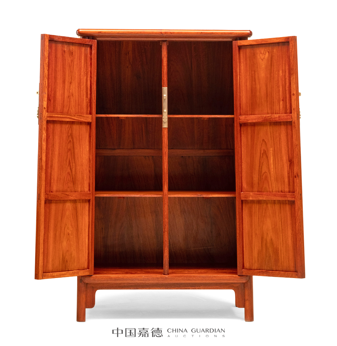圆角柜以缅甸花梨木制,有闩杆,无柜膛,整器呈A字形,侧脚显著。柜帽喷出,四根腿足纳入柜顶边框,柜顶平坦可置物。柜门攒边打槽镶嵌一幕对开的独板板心,纹饰对称美观,柜门镶长方形面叶,配透雕如意云头纹面叶,可上锁。柜内置两层隔板,将空间一分为三,便于储物。腿足间安光素刀牙板。
