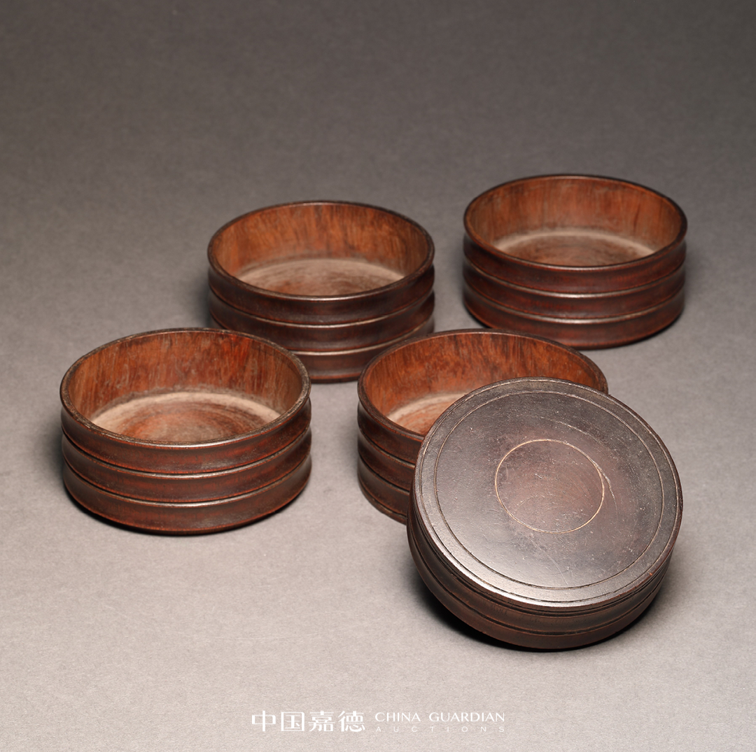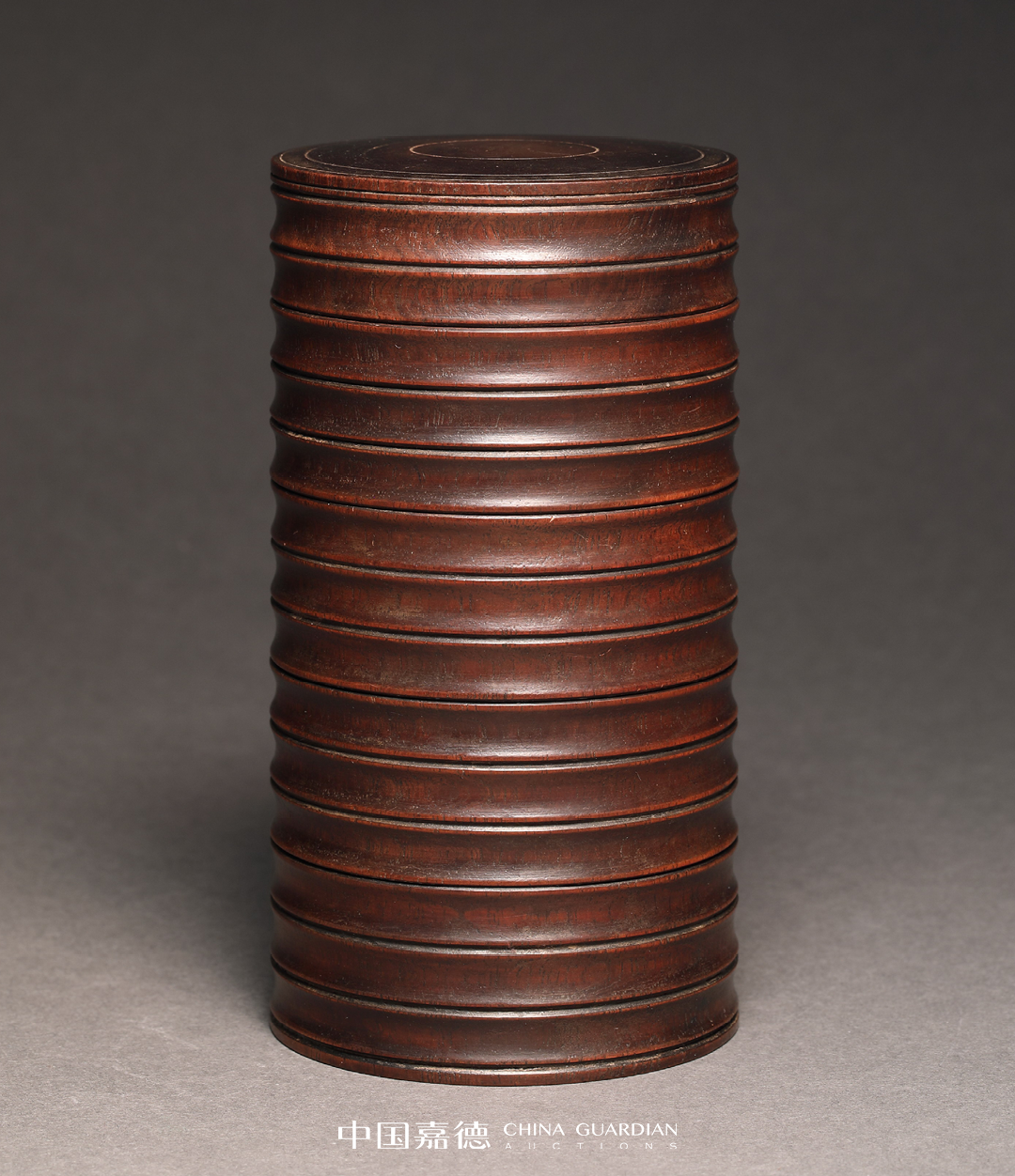 此黄花梨香盒,以平行阳刻之弦纹仿竹节造型,每三节为一撞,共五段,四盒一盖。盒盖环形弦纹填金,盒底可见木纹断面。器身子母相合,竹节均匀,严丝合缝,五撞全部盖起时,似一整器,颇费功力。制器如斯,非庸匠可为。