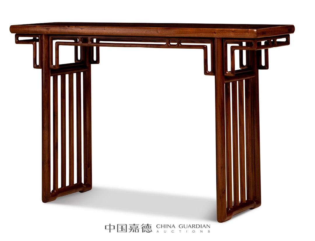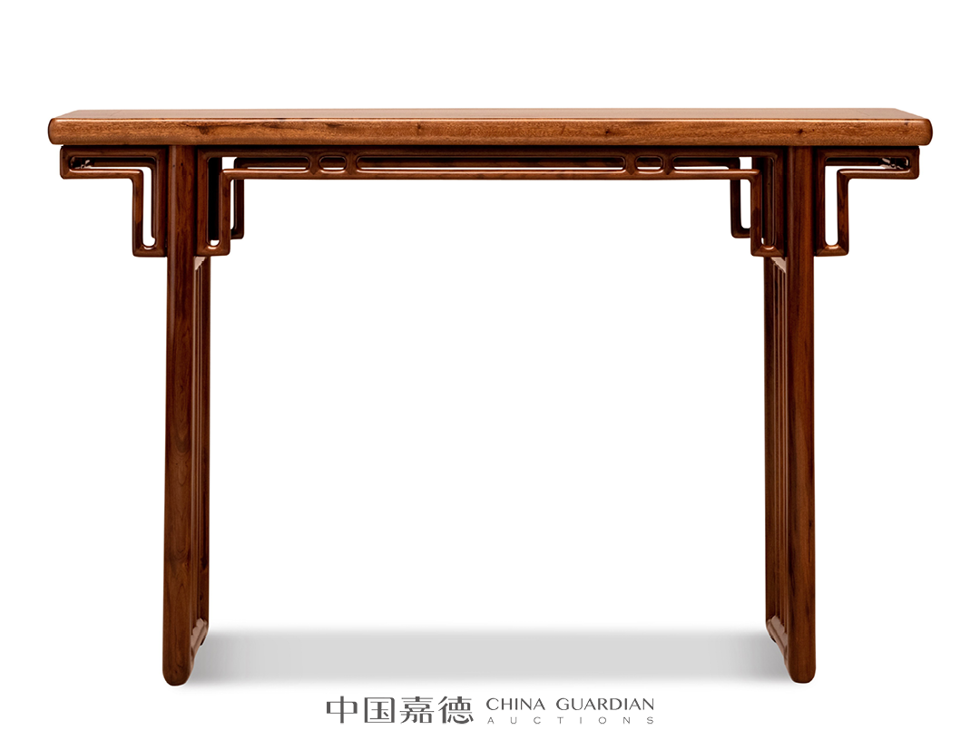 此案以金丝楠木老料制作,格角攒边框镶嵌板心,边抹素混面。其特色在于托泥以上挡板部分安四根直棂,十分简洁。这种造法还保留着隋唐以来直栅横跗案的遗意,仿佛是从日本正仓院藏的唐黑漆涂十八足几简化而来,在宋代以前颇为流行。另一个特色是牙条和牙头以圆材拼接边框而成,中间置两组双矮老。如此,使整张案子显得空灵而又剔透,轻盈而又舒朗。
