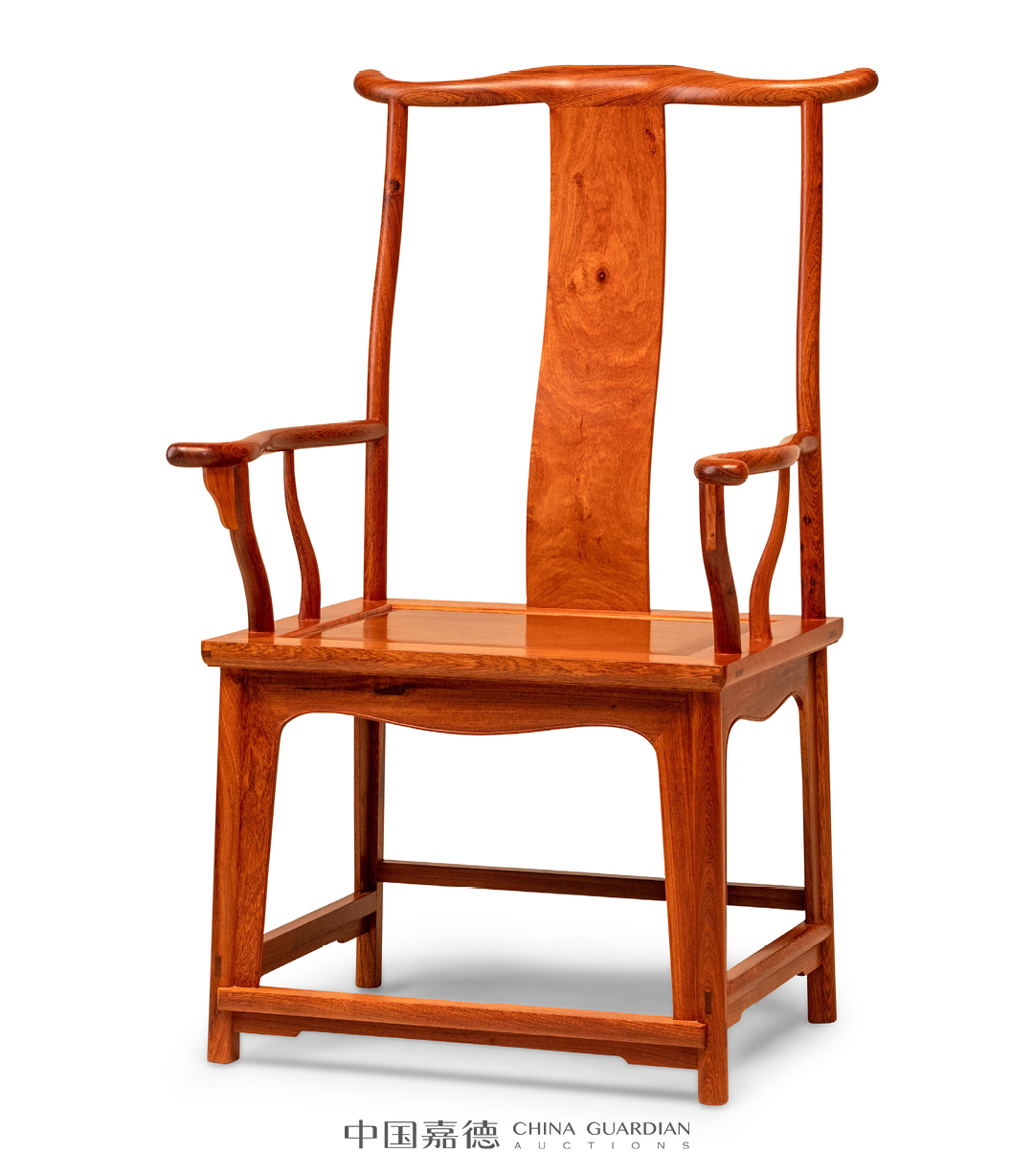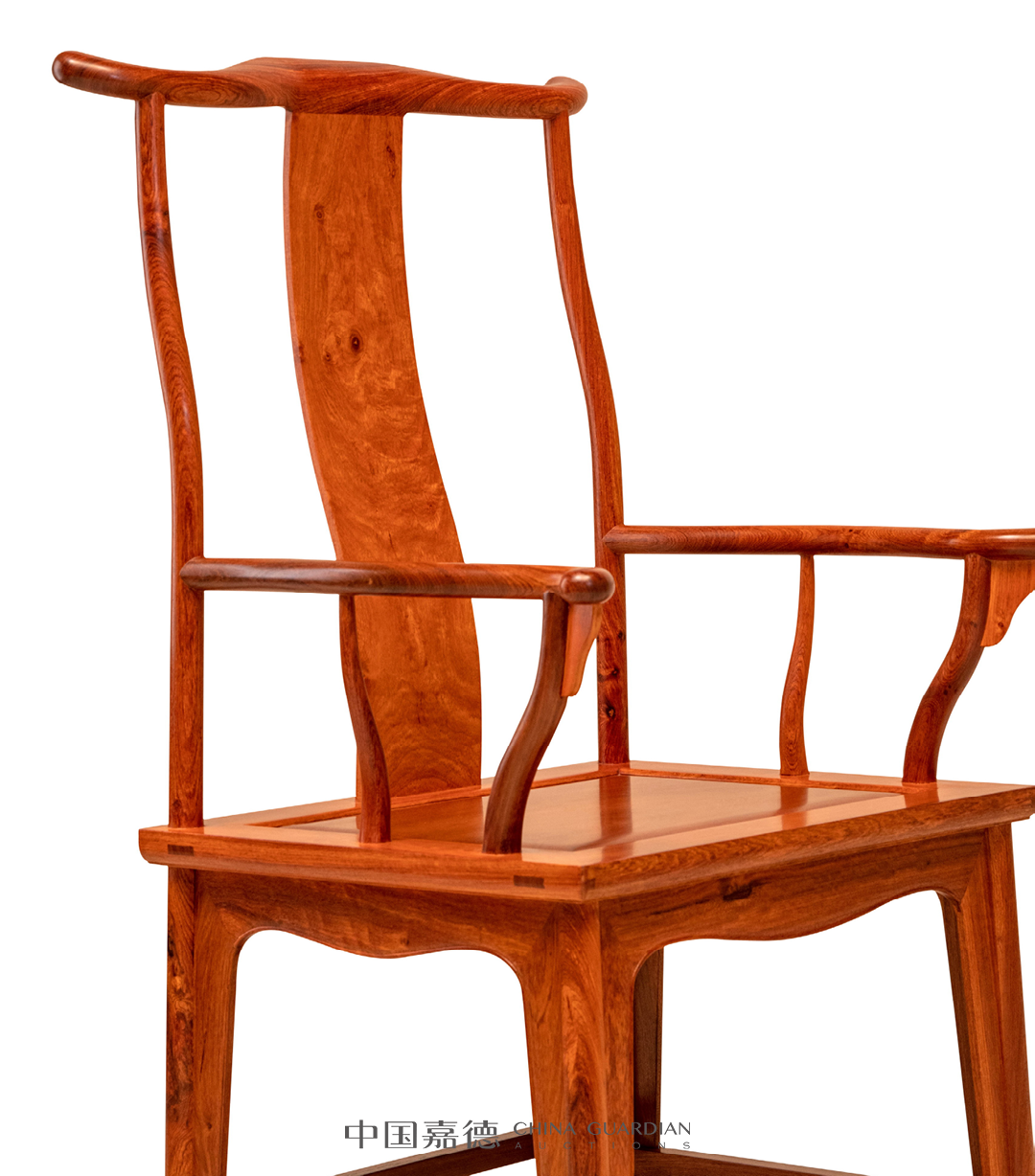 搭脑中间宽厚,两端弯曲上翘,如水牛角状,与后腿上部格肩相交,后腿上部下直上弯,靠背板呈S形。扶手、鹅脖、联帮棍亦为三弯式,并有角牙。座面以格角攒边框镶嵌板心而成,落堂起鼓作,出明榫。腿足外圆内方,座下三面安洼堂肚式券口牙子,牙条、牙头沿边起阳线,背面腿间安光素刀牙板。足间施步步高管脚枨。