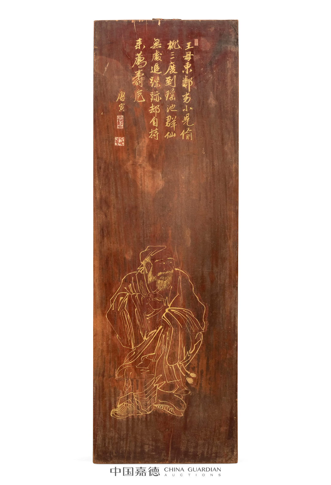 匾额楠木制,髹漆镌刻以“东方朔偷桃”为题。画面镌刻一老者,身着宽袍大袖,躬身侧首,一手托桃,一手紧提衣襟,轻手蹑脚,时而回首,唯恐为人所见的诙谐形象跃然其上。画面上方题刻唐伯虎题画诗:王母东邻劣小儿,偷桃三度到瑶池。群仙无处追踪迹,却自持来荐寿卮。钤印:吴郡、南京解元、六如居士。