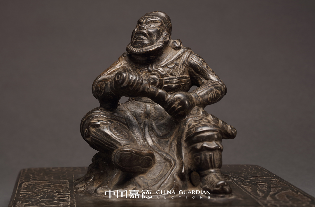 关羽剑眉星目,正襟危坐,右手捋髯,左手持书,神情专注,似在细细品读,其袍身、鞋履纹饰刻画入微。镇面环饰草叶螭龙纹,祥云环绕其间,与关羽智勇双全,义薄云天的形象相配。
