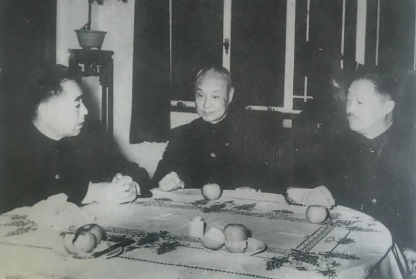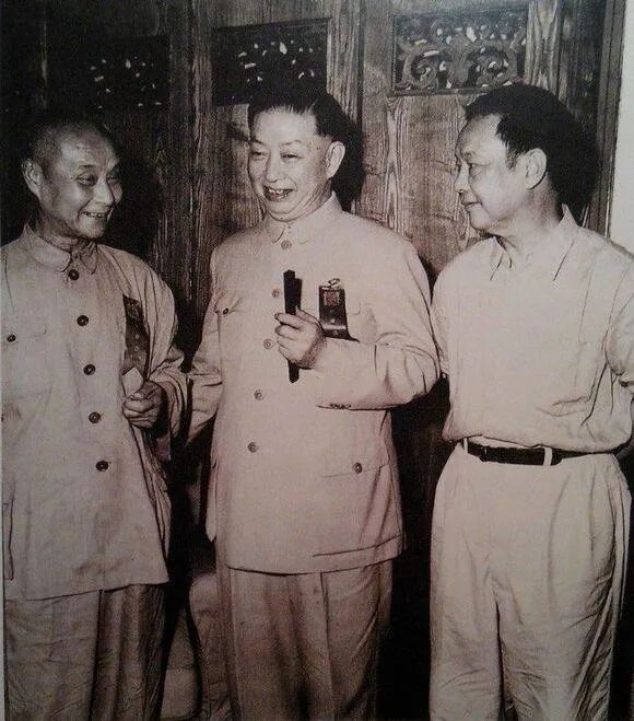 从左至右:盖叫天、梅兰芳、周信芳(1950年,盖叫天参加上海戏曲界救灾大义演,于天蟾舞台,与梅兰芳、周信芳等同演京剧《甘露寺》,饰演赵云)
