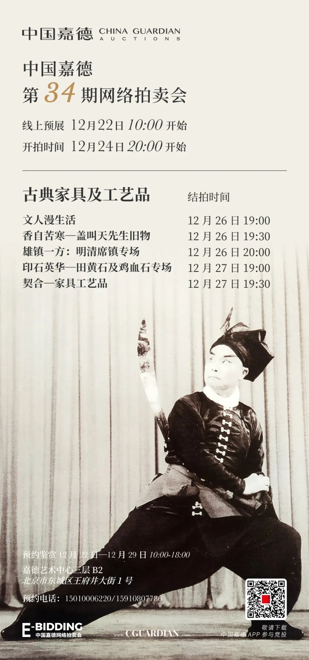 35期网络拍卖会,古典家具及工艺品部推出京剧名家盖叫天旧藏的《香自苦寒—盖叫天先生旧物》专场,共22件(组)拍品,直接征集自盖叫天后人。