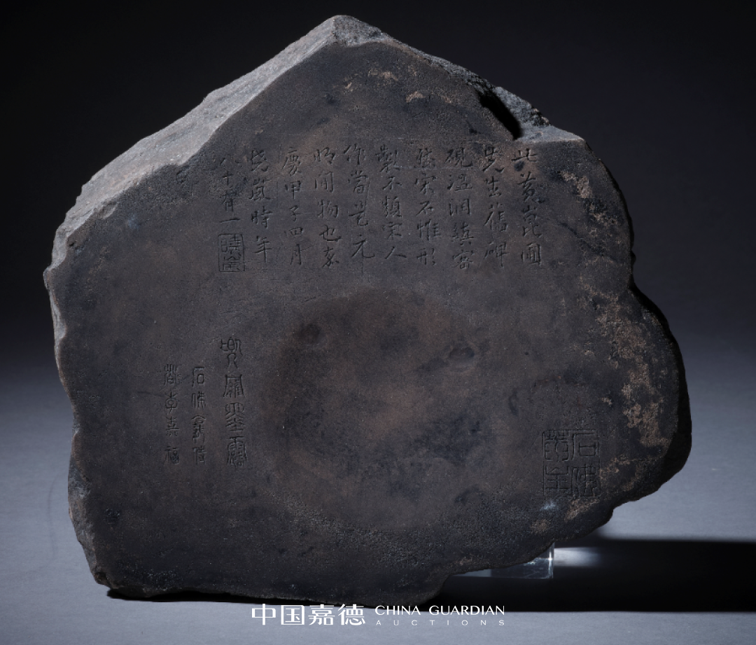 此砚以残碑石随形制,砚面镌刻长篇行书题跋:“此黄山昆圃先生旧碑,砚温润缜密。然宋不惟形制,不类宋人作,当时元明间物也。嘉庆甲子四月晓岚时年八十有一。印文:晓岚。”另,篆书砚铭:兜罗墨露,石佛菴侍者李嘉福。篆书印文:石佛菴主。
