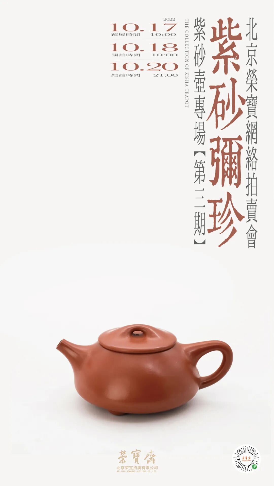 北京荣宝——紫砂弥珍紫砂壶专场网络拍卖会(第三期)将于10月17日10:00-10月18日10:00开启线上预展,并于10月18日10:00开拍,10月20日21:00结拍。